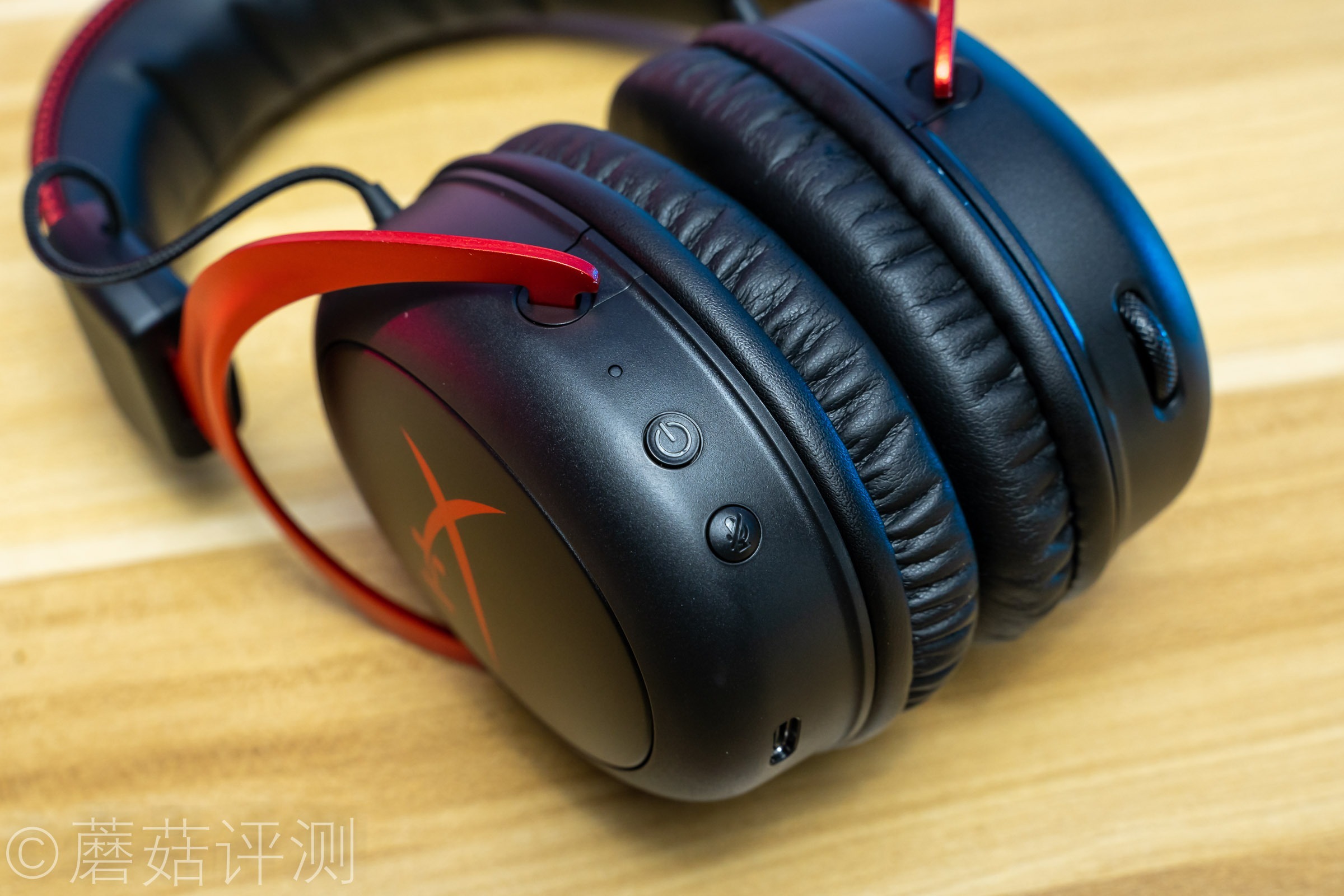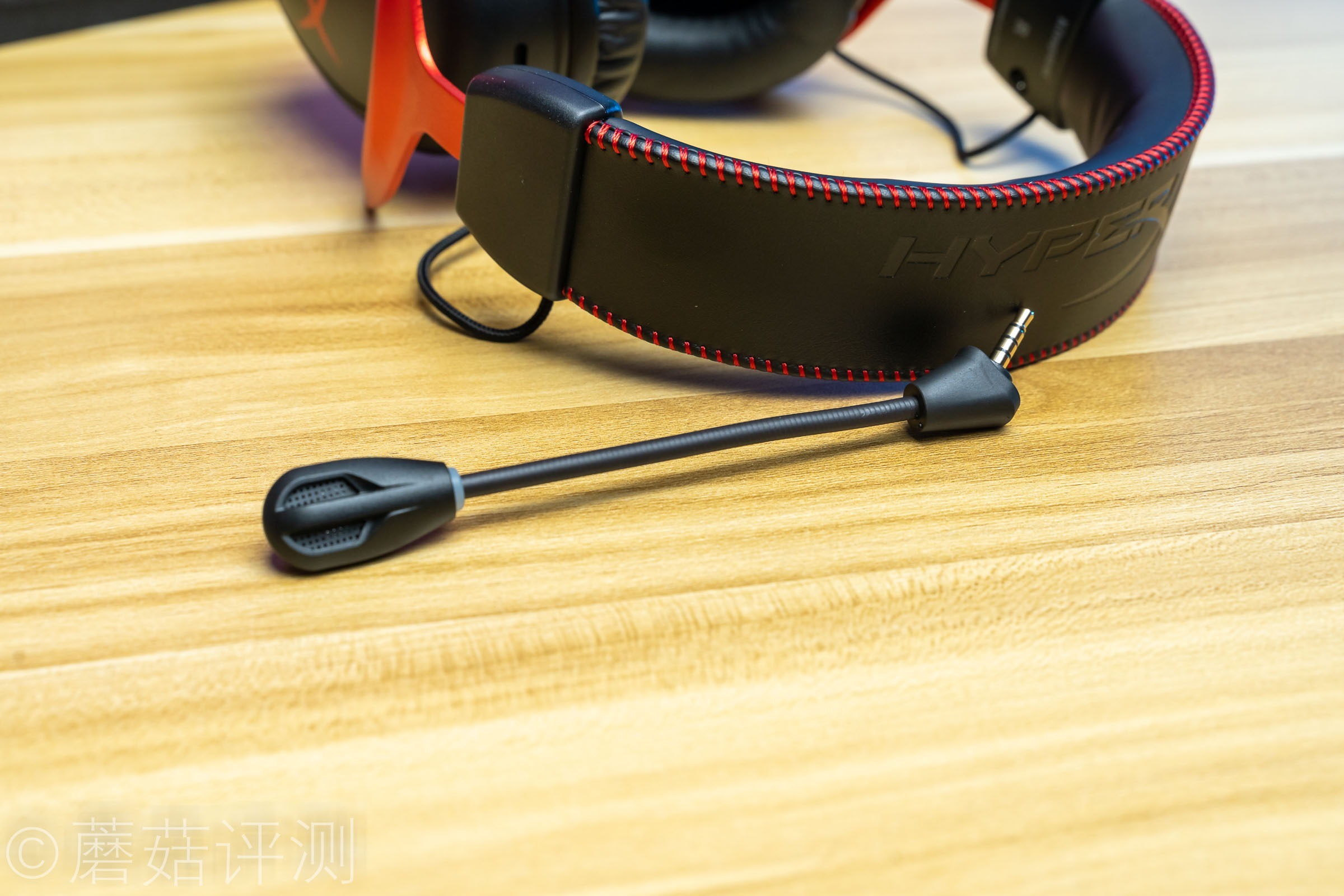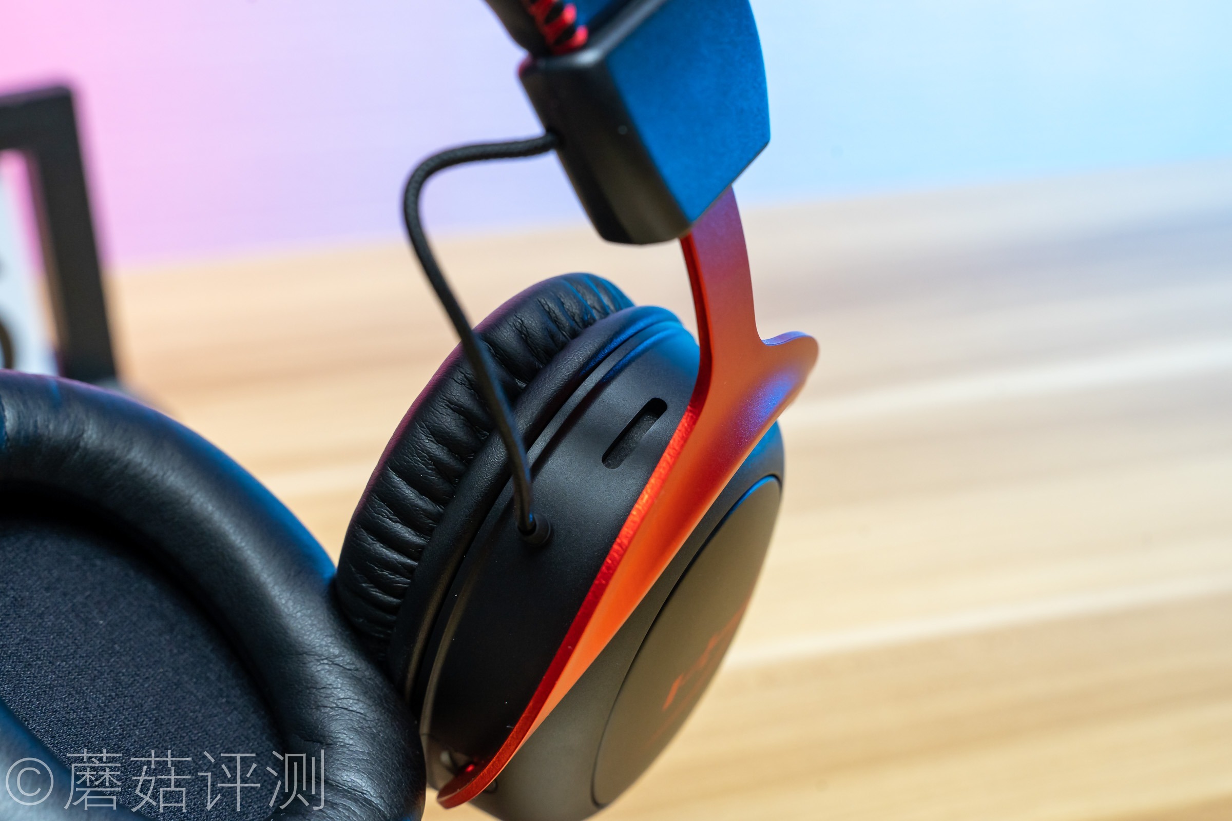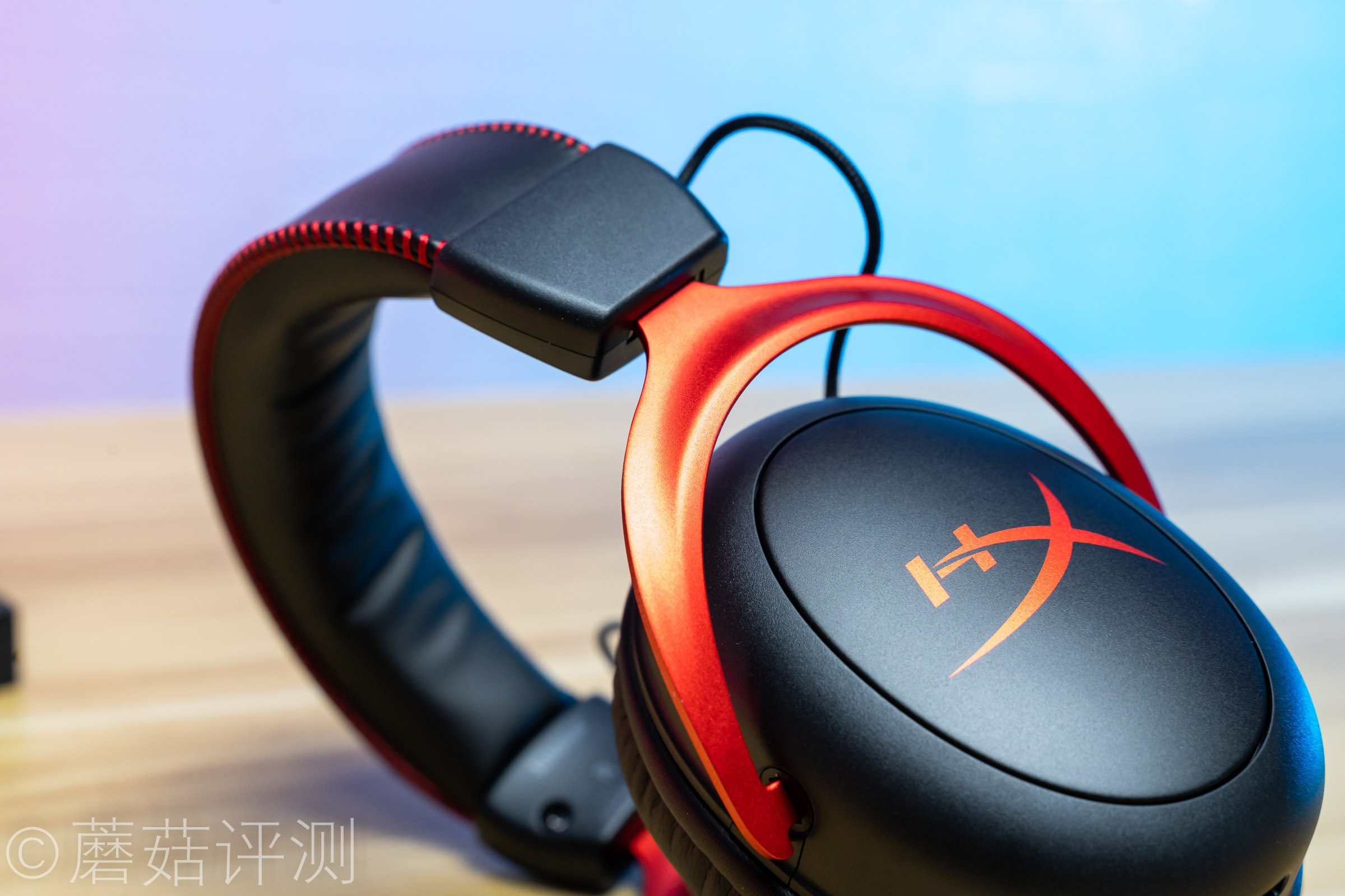 ▼耳机头梁顶部有硕大的HyperX的LOGO,同样是皮质的,两侧有红色的缝线,看着很漂亮。