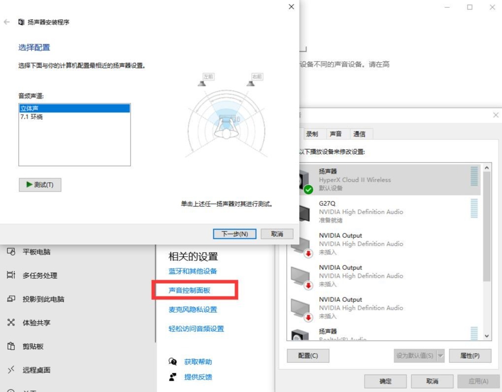 ▼接着点开声音控制面板,可以将音频声道从立体声切换为7.1环绕。