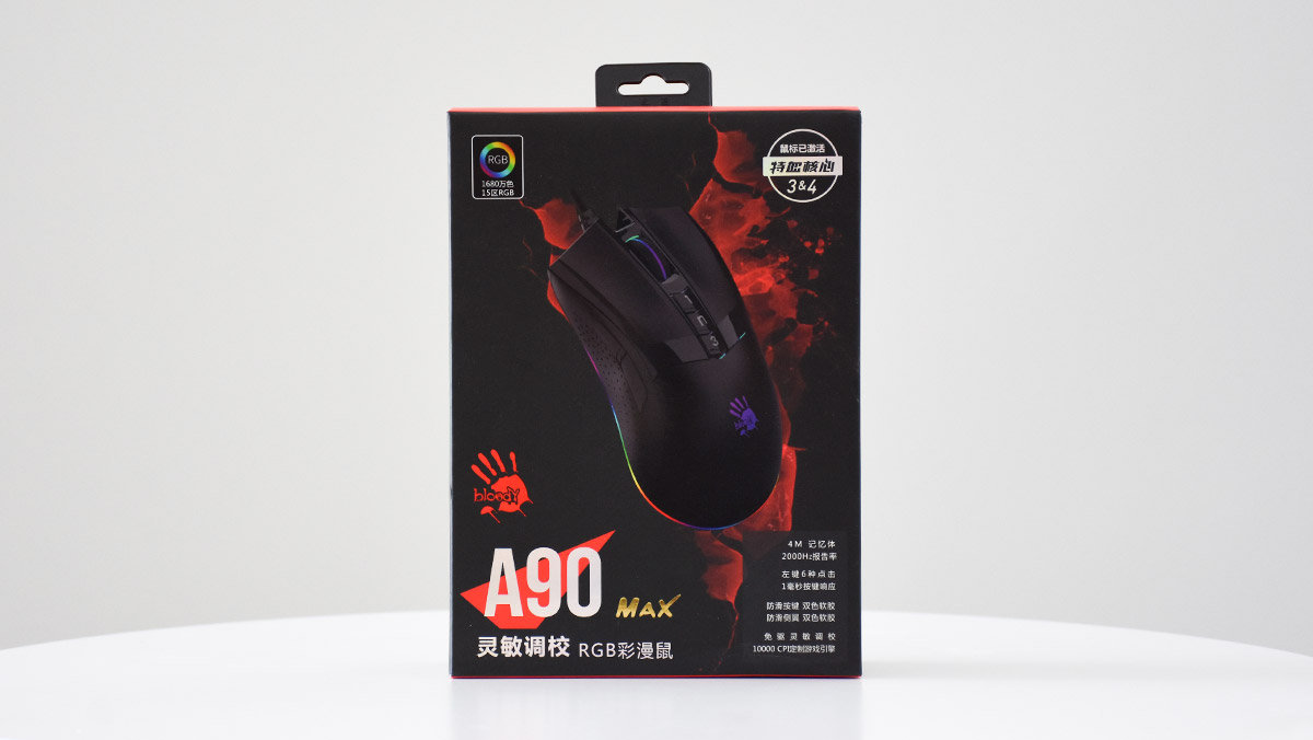 包装方面采用了经典的黑红撞色风格,盒子正面印有A90 Max鼠标的渲染图以及相关的文字,鼠标背后类似“鲜血喷溅”的图案十分醒目。