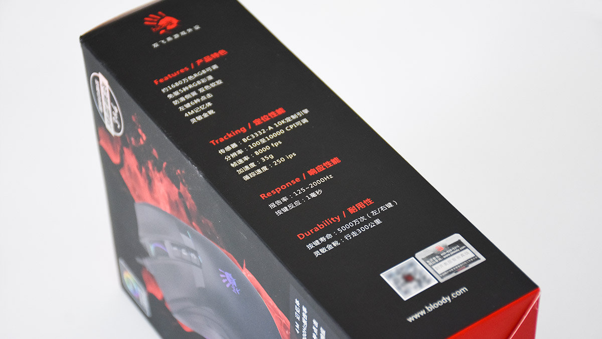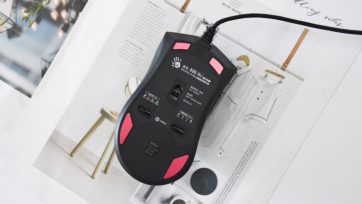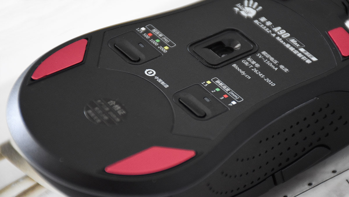 硬件方面,血手幽灵A90 Max搭载的是双飞燕定制的BC3332-A光学追踪引擎,拥有10000CPI的定位精度,加速度为35G,追踪速度为250IPS,回报率为2000Hz,从参数上来看确实称得上是比较强悍的水准了。在默认状态下支持5个免驱CPI档位,可以在1000~10000之间进行切换,以满足不同场景下的使用需求。