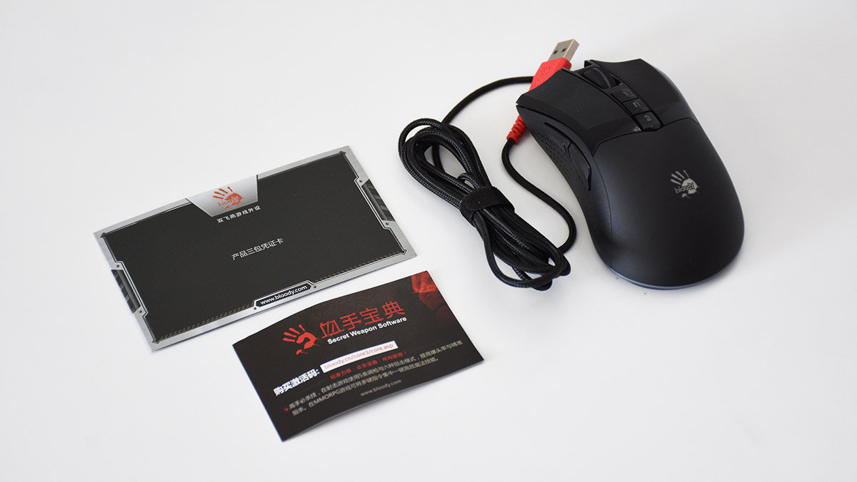包装内容也并不复杂,只包含有鼠标、贴纸、三包卡片以及血手宝典的激活码卡片。