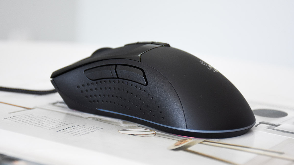 鼠标侧边与底部衔接的部分镶嵌有一圈RGB灯带,通电以后灯带部分亮起呈现出不同的视觉效果,好似对整个鼠标起到承托的作用。同时鼠标背部的血手幽灵Logo处也有RGB灯效的设计,支持五彩斑斓的颜色闪烁,当然也可以在驱动中自定义颜色和灯效。