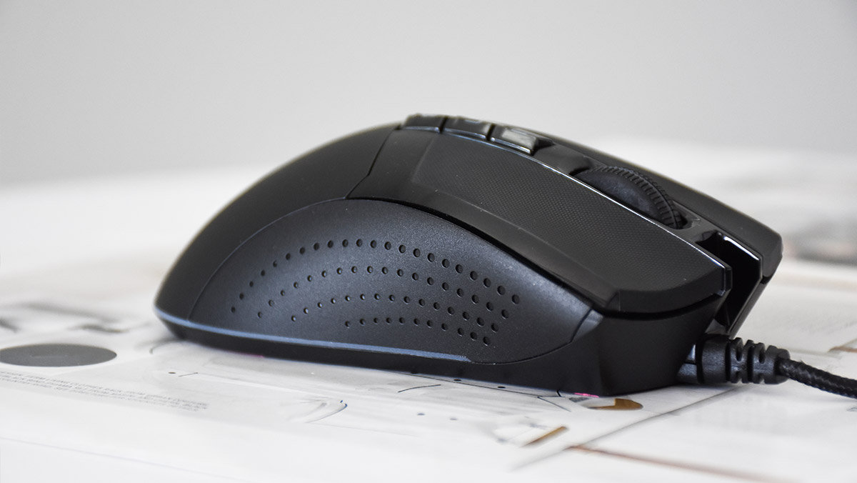 鼠标左右两侧的侧裙部分同样采用软胶材质,并且设计了凹陷的防滑纹路,提升握持舒适度。上方也加入了两颗自定义侧键,按键的阻尼反馈与左右键有所不同,支持在驱动程序中自定义功能。