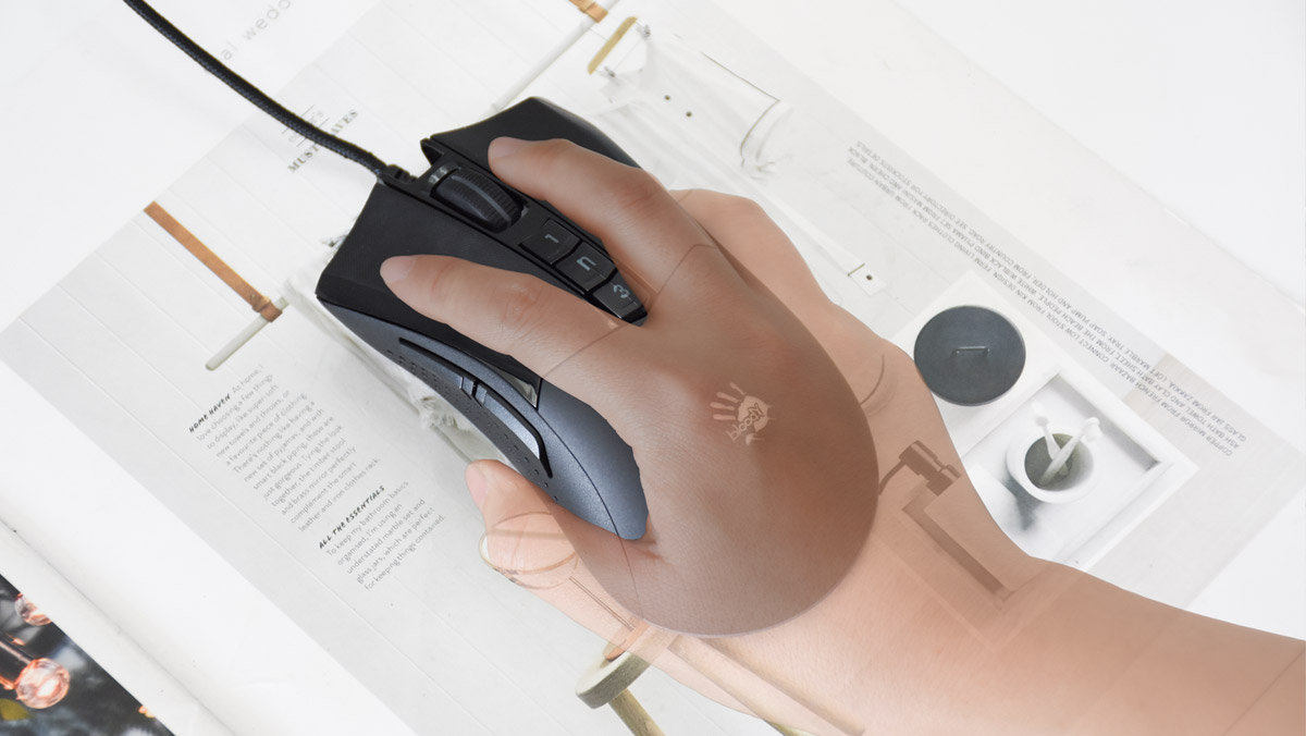 血手幽灵A90 Max显然就是非对称式的设计,更多的照顾到了右手习惯的用户。鼠标整体的尺寸还是要偏大一些,更适合男性用户使用,主要以趴卧的姿势为主。