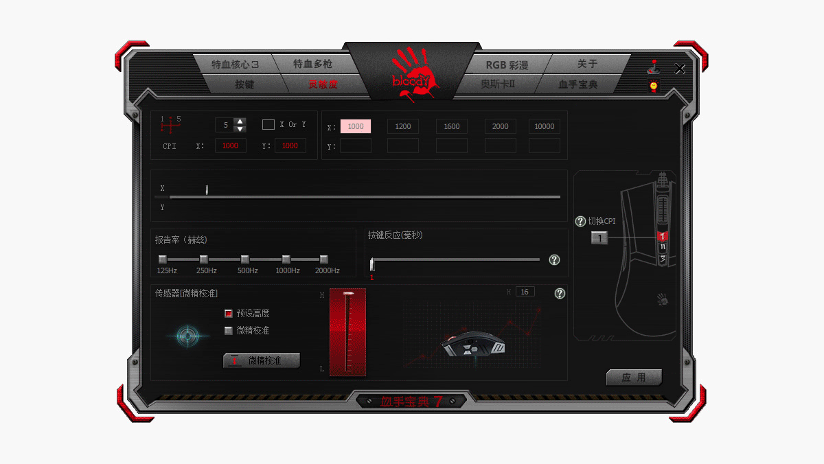 灵敏度模块中包含CPI、传输报告率、传感器微调以及按键反应等方面的调节;奥斯卡II选项中则是编程类模块,专业玩家可以通过编程和修改参数实现更快捷的操作;血手宝典模块中已经根据各类游戏提供了预设的参数设定,玩家只需选择好游戏并应用到自己的鼠标即可,完全无门槛的使用体验。