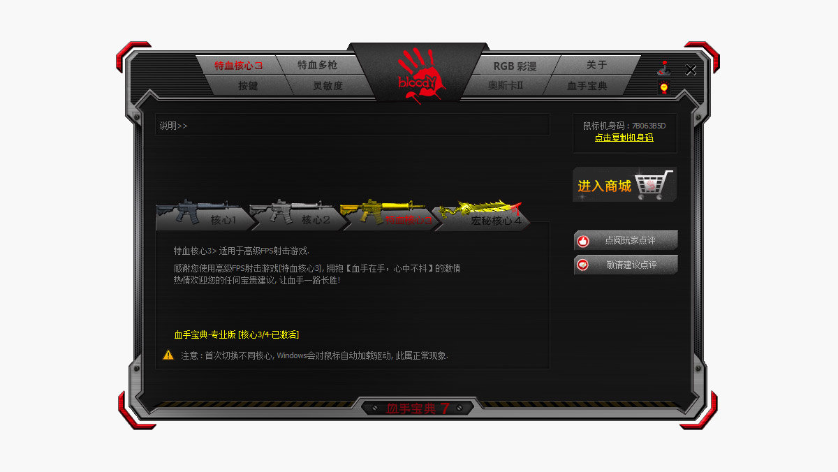 双飞燕也为这款鼠标提供了驱动程序,叫做血手宝典,在血手幽灵产品的官方可以下载安装。软件界面也非常具有电竞气息,双飞燕也根据大多数玩家和游戏的适应情况设计了四种模式,比如核心1适用于角色扮演类游戏,核心2适用于初级FPS类游戏,特血核心3适用于高级FPS类游戏,宏秘核心4适用于高级MMO/RPG类游戏,点击对应的模式就可以将整套完整的设定参数匹配到自己的鼠标上。