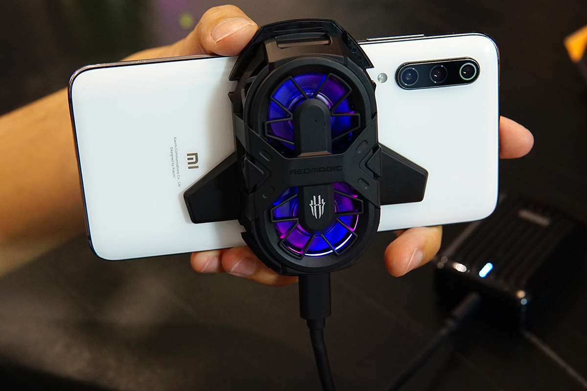 单从外观造型上来看,红魔双核散热背夹很有硬汉风,硬朗的线条很具工学美感,第一视感非常舒服。以潮范君的小米9手机作为参考,固定在手机背部后,手机两端预留出的空间很大,满足双手握持手机,进行游戏操作的要求,并且不会增加太多重量,双手横屏握持下,配重在合适的范围内。