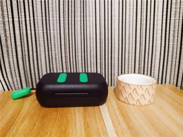 充电盒也非常小巧,与普通的窄胶带等高,目测可见,身材略比胶带大1/3左右。这个身材,无论是衣服口袋、钱包、挎包都是完全没空间压力的。