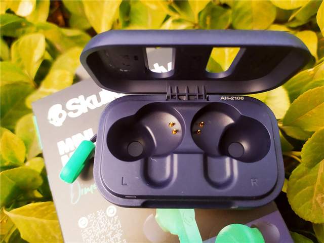 取出Skullcandy Dime迷你豆充电盒,墨蓝色非常耐看,舱底的骷髅头个性十足。
