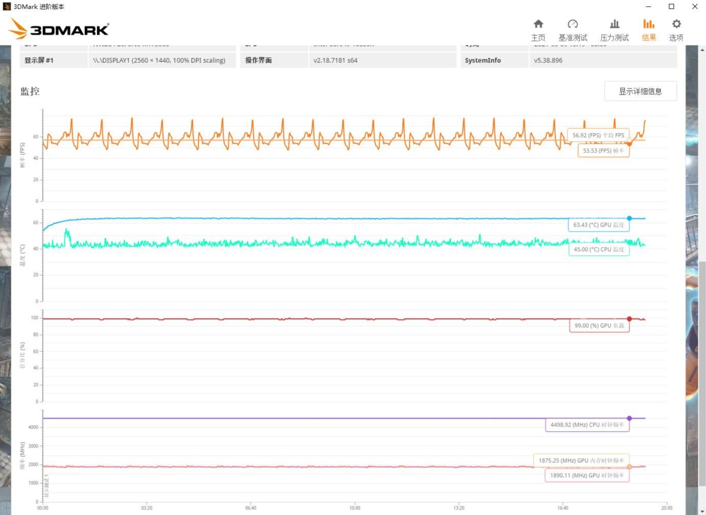 ▼最后跑一下3Dmark的压力测试,帧数稳定率99.4%,很稳定。