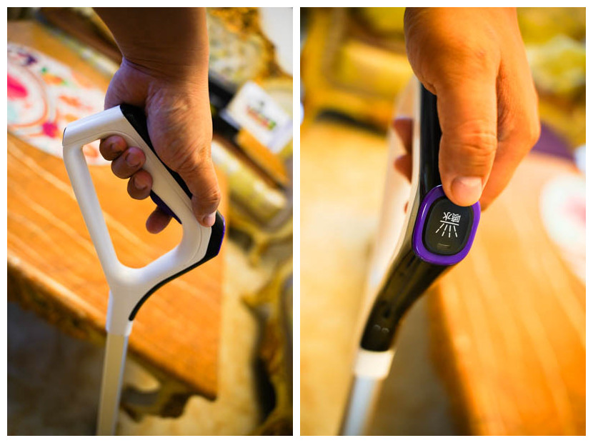 握柄部位有两个按键,一个是枪式开机键,按下就启动吸尘功能了。如果按下握柄前端的“洒水”键,它的拖布头部位就会喷水,这样就是吸拖双管齐下。操作就是这么简单,小朋友也能快速上手。