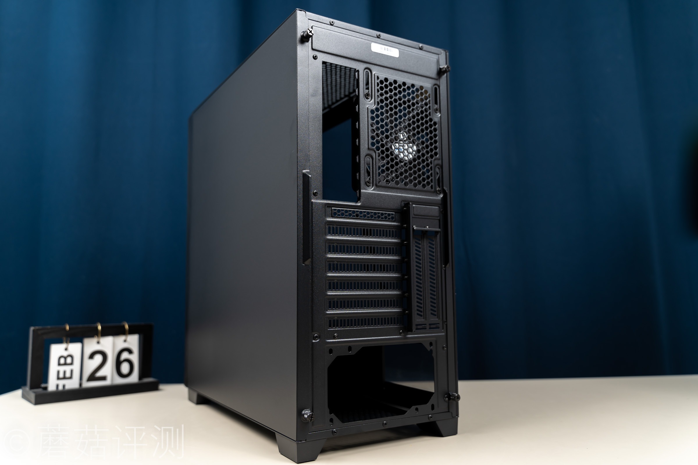 ▼机箱后部标配一把120mm规格的机箱风扇,顶部可以固定360冷排,主板固定位四周有多个开孔,方便走线。