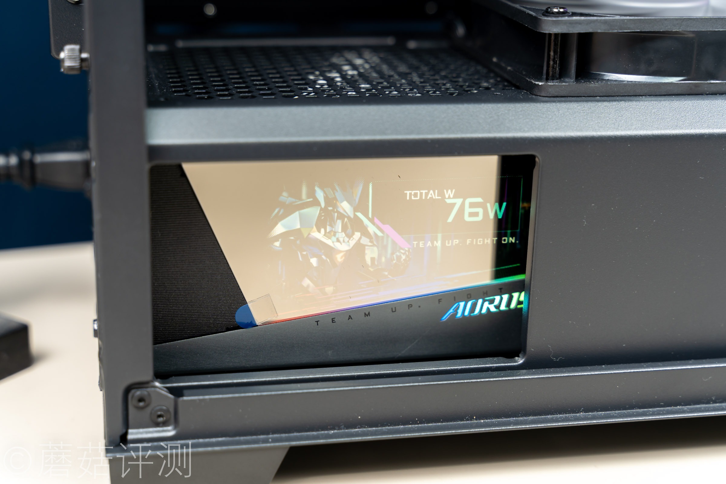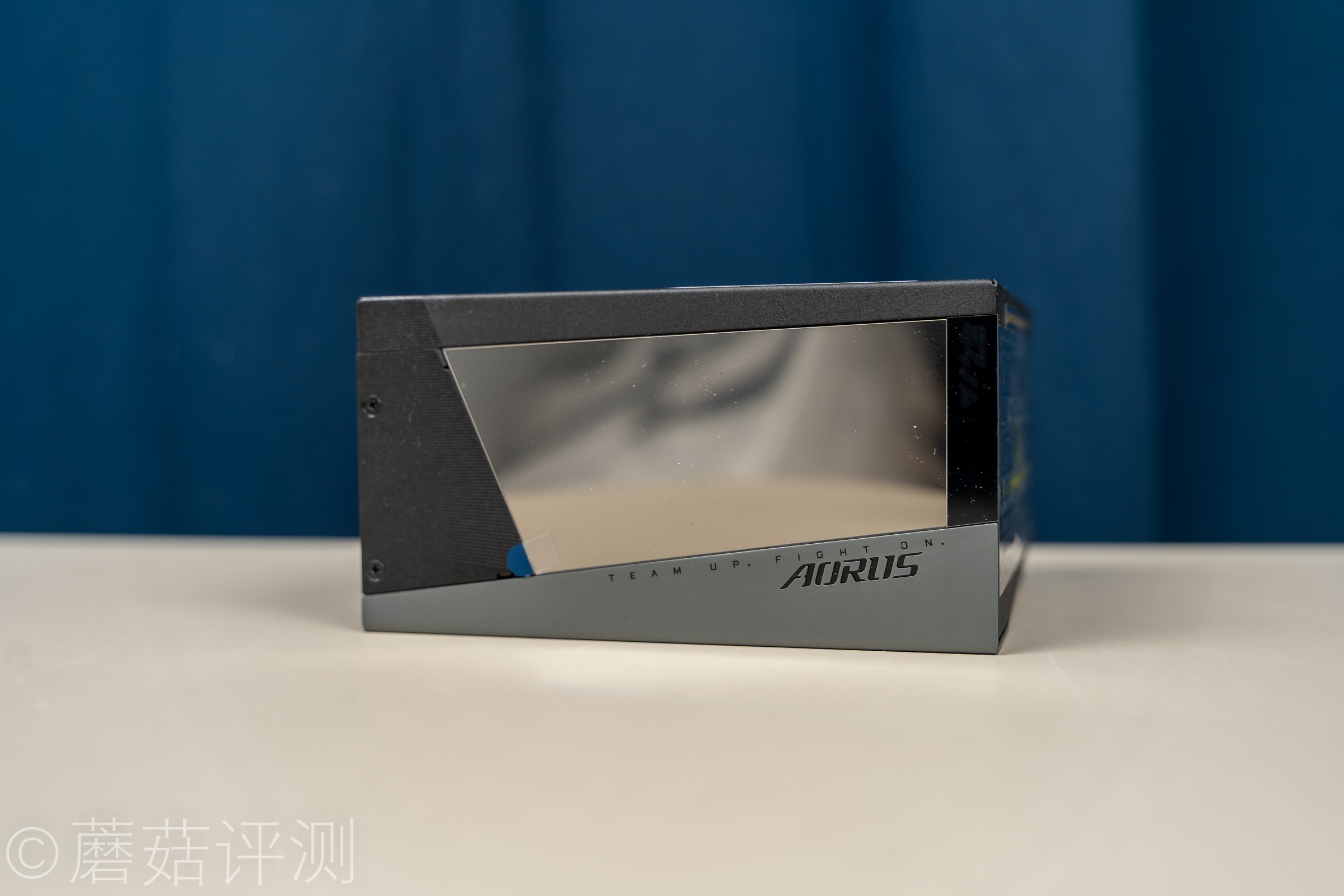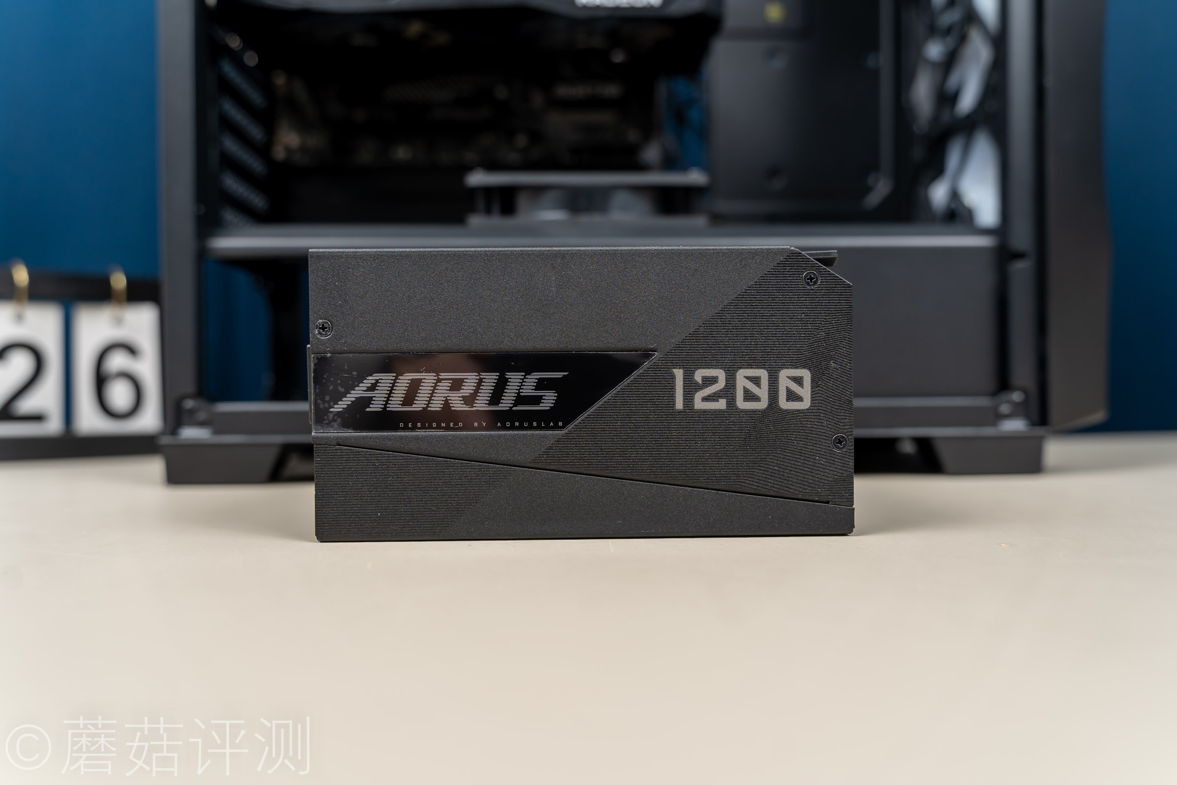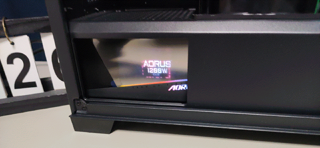 ▼电源的侧面有技嘉的LOGO,是有灯效的,旁边有1200的字样,告诉用户这款电源的额定输出功率在1200W。