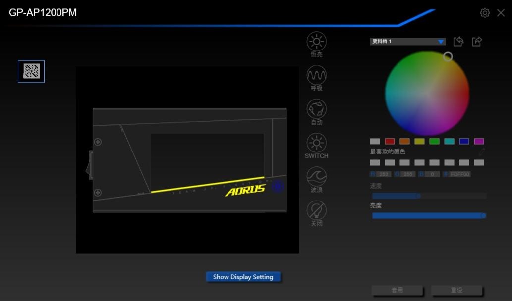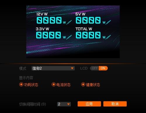 ▼技嘉这款电源的灯效部分是支持软件控制的,RGB灯效和屏幕是分开独立控制的,灯效部分可以和主板、内存等其他硬件联动。