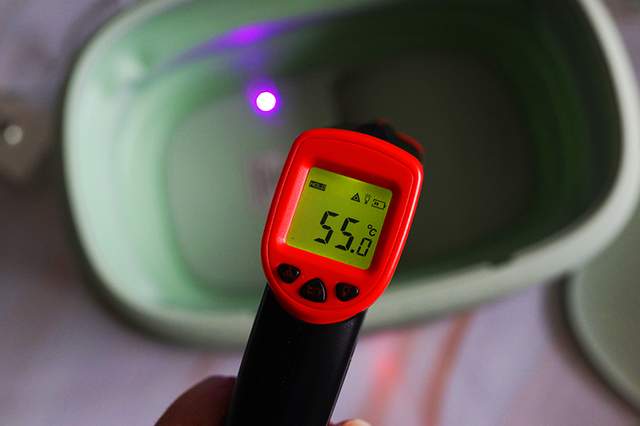 在烘干过程中,我暂时将衣物取出,测量了一下出风口处的温度,可以看到显示为55℃。