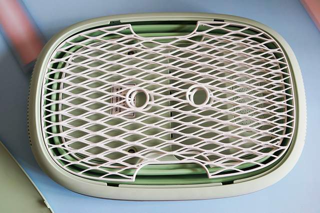 揭开盖子来看看,里面附带了两个用于放置衣物的网状隔板,其中下面一个要稍小一些。利用它可以将内部空间进行分层,这样就可以一次烘更多的衣物。