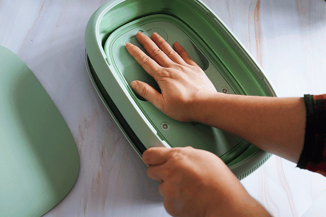 使用时需要先将烘干盒展开,方法很简单,只要一手按住主机底部,另一只手抓住边缘稍微用力往上拉即可。