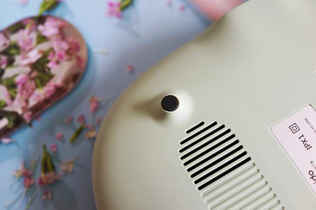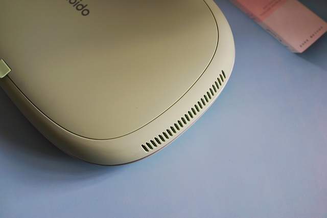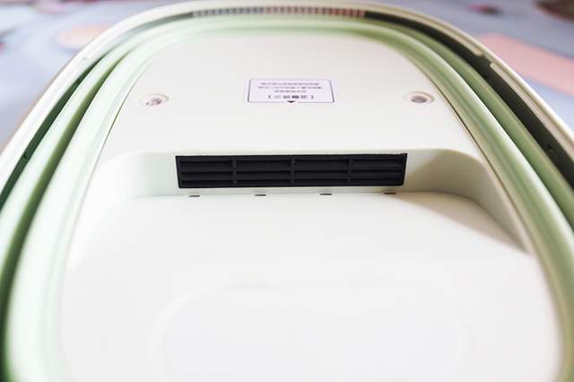 在主机的底部采用斜面的设计,这里可以看到一个微型的出风口,热风就是从这里吹出来,然后在盒子内部循环,从而起到热烘的效果。