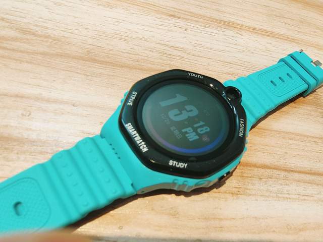 手表整体呈现湖蓝色,表盘是黑色。整体很年轻很鲜艳,属于适合儿童使用的颜色,第一眼就喜欢。