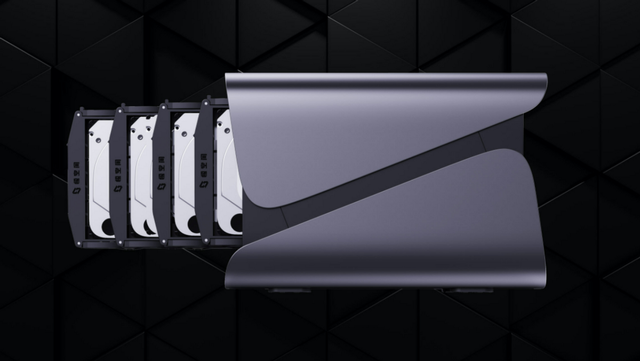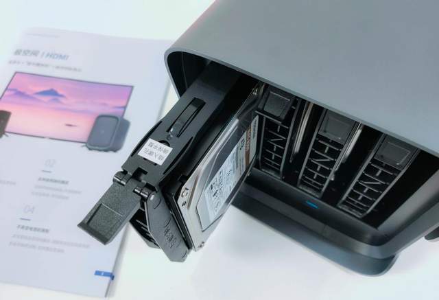 取下磁吸面板便能看到四个硬盘位,将卡扣拨开即可抽出,整个过程十分顺滑,四个硬盘位采用了一体式设计,掰开左右的固定件放入硬盘重新合上固定件即可。4个硬盘位支持2.5/3.5英寸SATA接口硬盘,单盘容量最高20TB,总容量高达80TB。