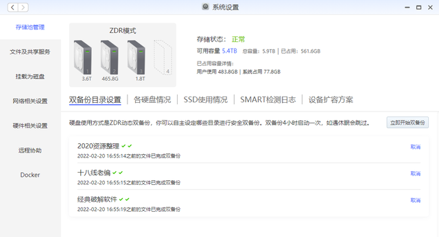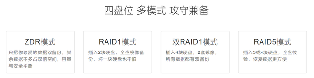 除了我们常见的RAID1、双RAID1和RAID5模式外,极空间新Z4还支持独家ZDR动态双备份模式,该模式下允许用户自主选择重要的数据进行双备份,既保证了数据的安全又节省了硬盘空间,在专业度上虽说没有前两者专业,但ZDR动态双备份模式更适合家庭使用,例如工作数据、家人相册等可以选择双备份,平时下载的影视、综艺等数据则无需备份。