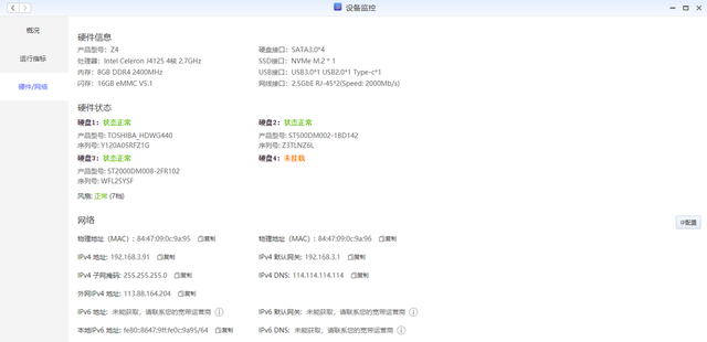 除了丰富的功能外,在对设备监控方面极空间新Z4同样可圈可点,在系统设置当中我们可以查看设备详细信息,包括当前各个硬盘情况、备份模式等。