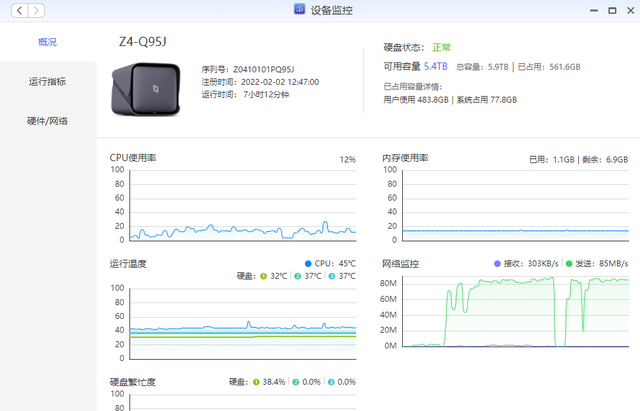 在设备监控当中,能实时查看CPU负载、内存使用率、各个硬盘温度、繁忙度等,设备出现任何问题一目了然,适合于有一定技术门槛用户。