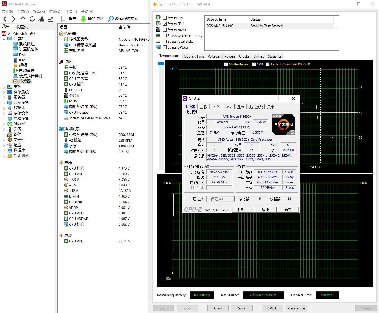 ▼单烤FPU测试,处理器全核心睿频4.575GHz,处理器温度81℃。主板的南桥温度26℃,显卡核心温度进一步降低到27℃,整机的风道表现还可以。