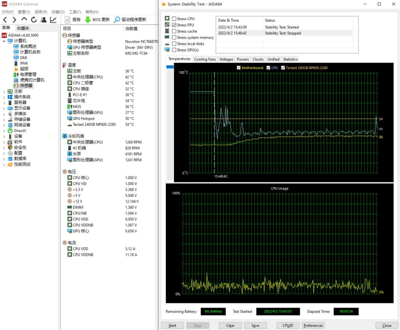 ▼显卡的核心温度最高在59.5℃,整体的散热效果表现不错,处理器温度在42.75℃左右波动,不错不错。
