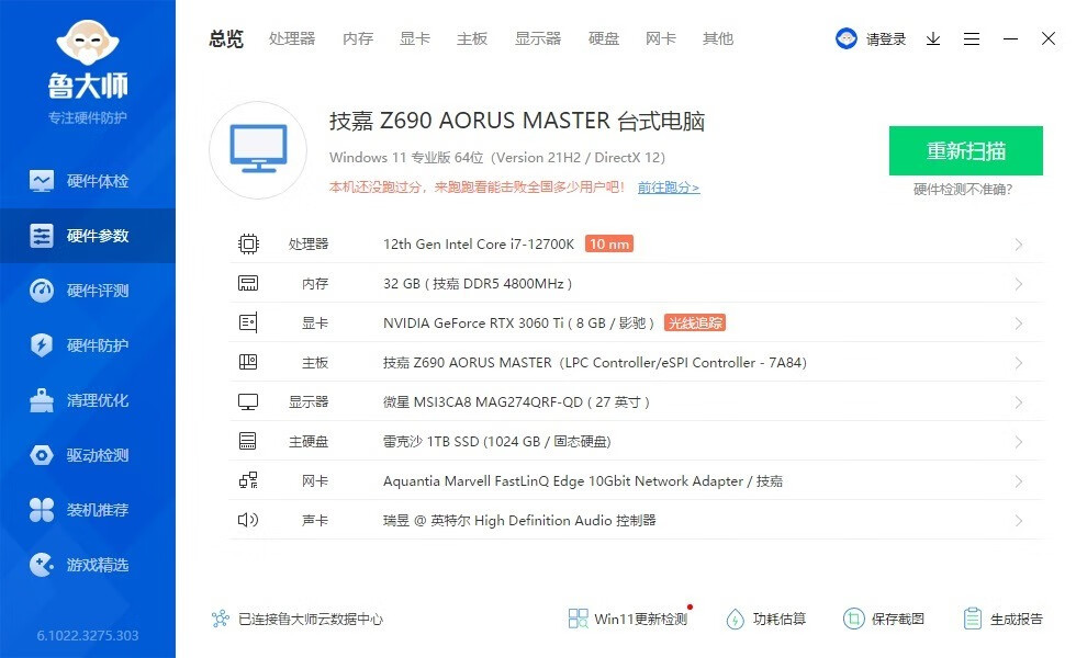 ▼整机配置一览,处理器是12700K,主板是技嘉的Z690 AORUS MATER超级雕,内存是技嘉的AORUS RGB DDR5 6000MHz内存套装32GB(16GB*2),显卡是影驰的RTX3060Ti星耀OC。