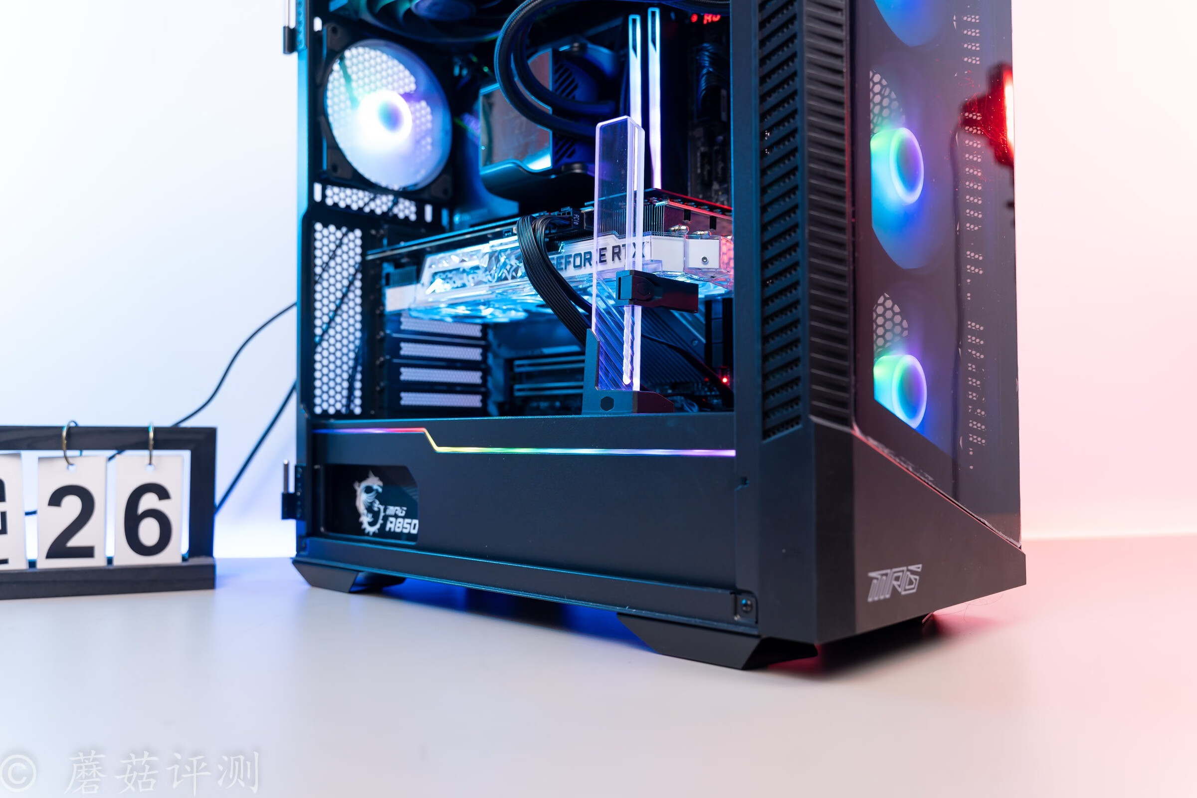 ▼机箱是刀锋100R,机箱前部有一大块侧透玻璃,内部标配了三把ARGB灯效的风扇,看着很漂亮。