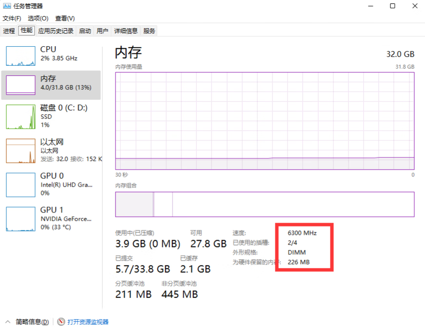 ▼系统的任务管理器正确识别了内存的频率,6300MHz左右。