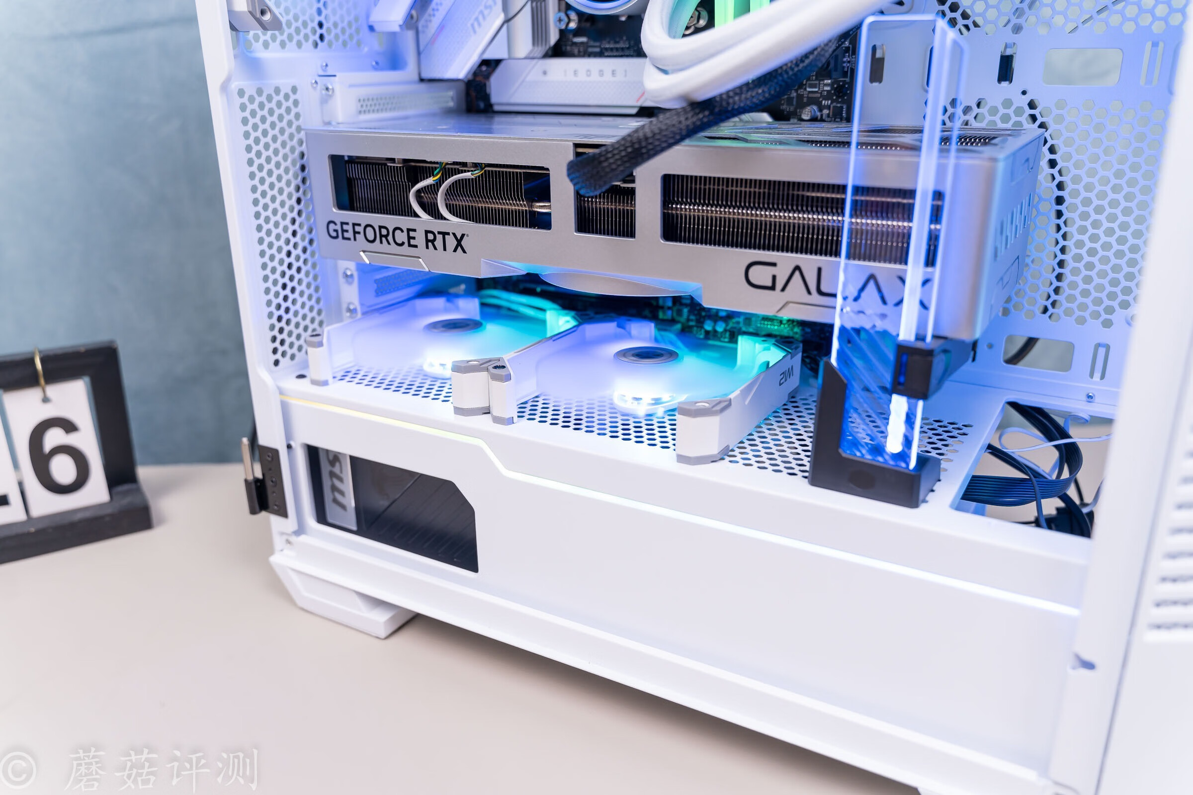 ▼机箱的内部设计也很有意思,电源仓侧面的顶部有一条ARGB灯带,效果非常不错。电源仓顶部还有两个机箱风扇的固定位,可以固定多把机箱风扇,专门照顾显卡部分的散热。