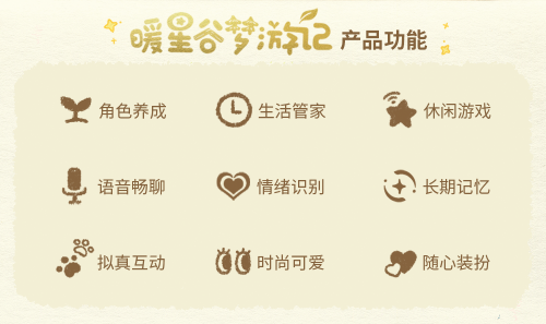 本次发布会上,定位于情感陪伴的治愈系暖星谷梦游记AI潮玩品牌正式发布,其“数字生命体”概念下的晚安羊和不忧鸟智能玩偶内置AI芯片,具备情绪识别、体感互动等功能,并配合暖星谷虚拟世界软件形成生态闭环,计划于2025年内上线。