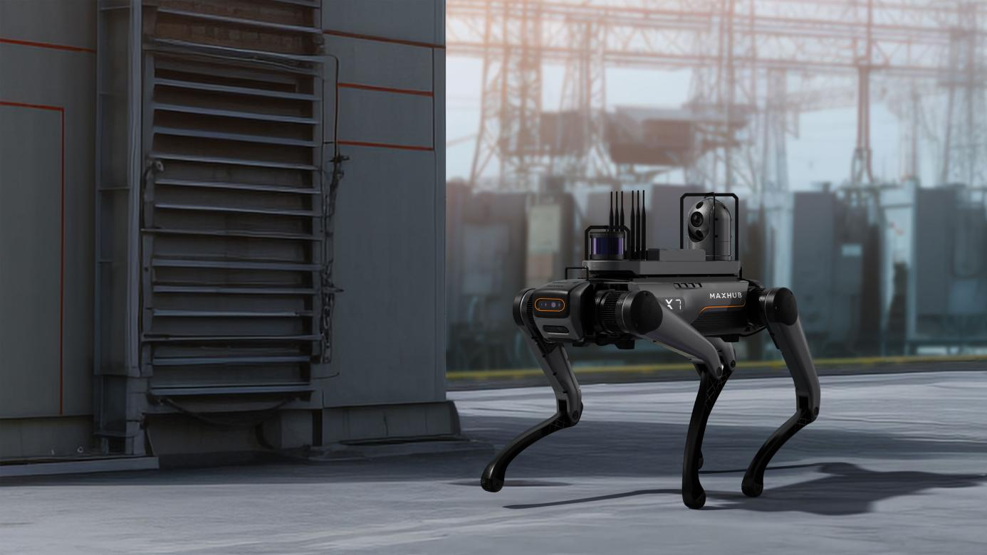 以工业级四足机器人“MAXHUB X7”为例,该产品已广泛应用于巡检、安防、应急等领域,展现出色的环境适应性与任务执行能力。MAXHUB X7具备多地形高通过性,可稳定攀越35°陡坡、应对台阶、沙石、草地等复杂环境。IP66防护等级使其无惧暴雨、粉尘和-20℃至55℃极端温度,支持全天候作业。通过搭载可见光+红外热成像双摄像头云台、气体传感器、机械臂等模块,MAXHUB X7能替代人工在电力巡检、工业安防、灾害救援等高风险场景中执行任务。目前,MAXHUB X7已成功应用于变电站、乳业工厂等多个真实场景,展现出极高的实用价值与可靠性。