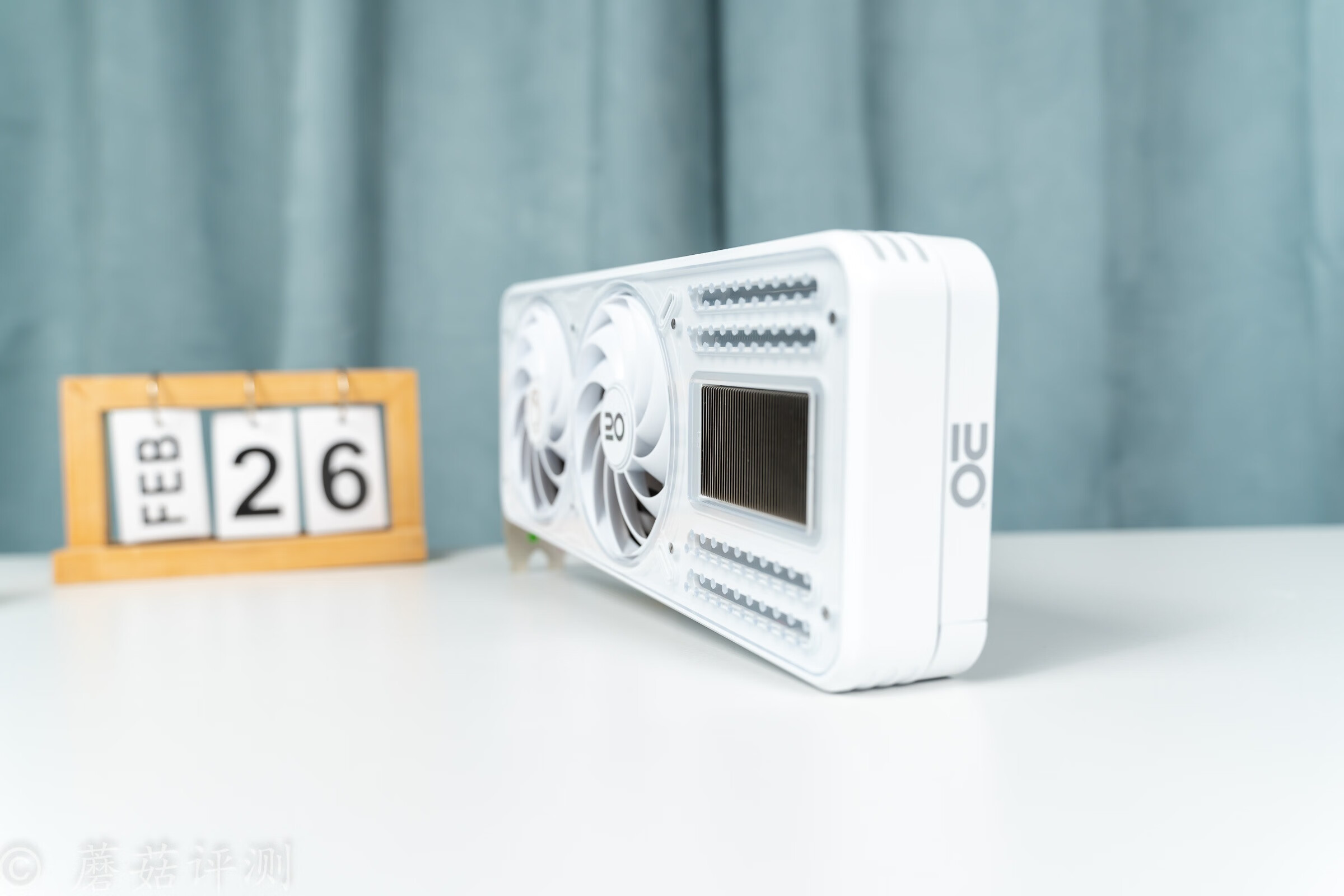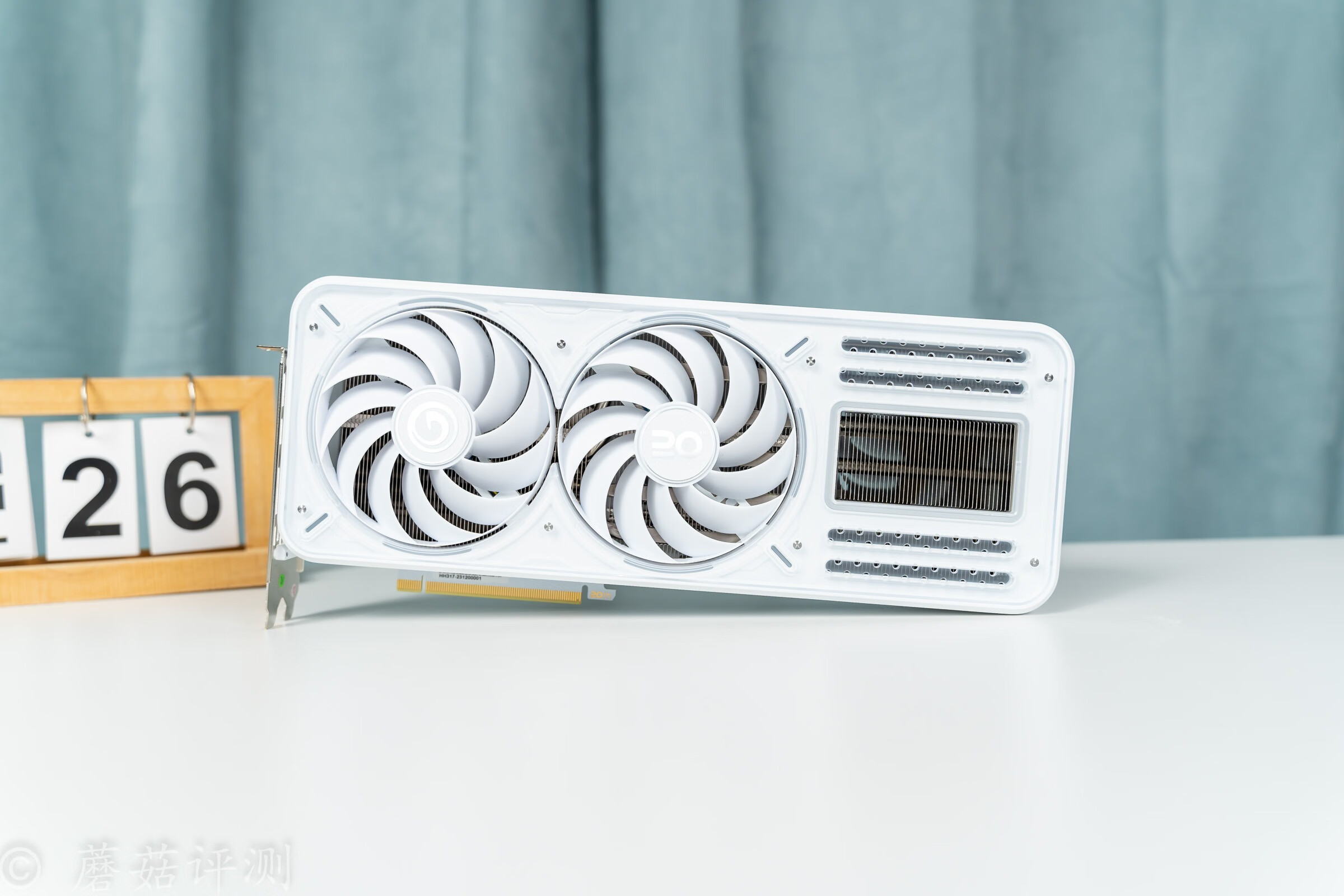 ▼显卡的正面外观非常漂亮,整体采用白色的配色,左侧是两把100mm直径的散热风扇,右侧有大面积的镂空。