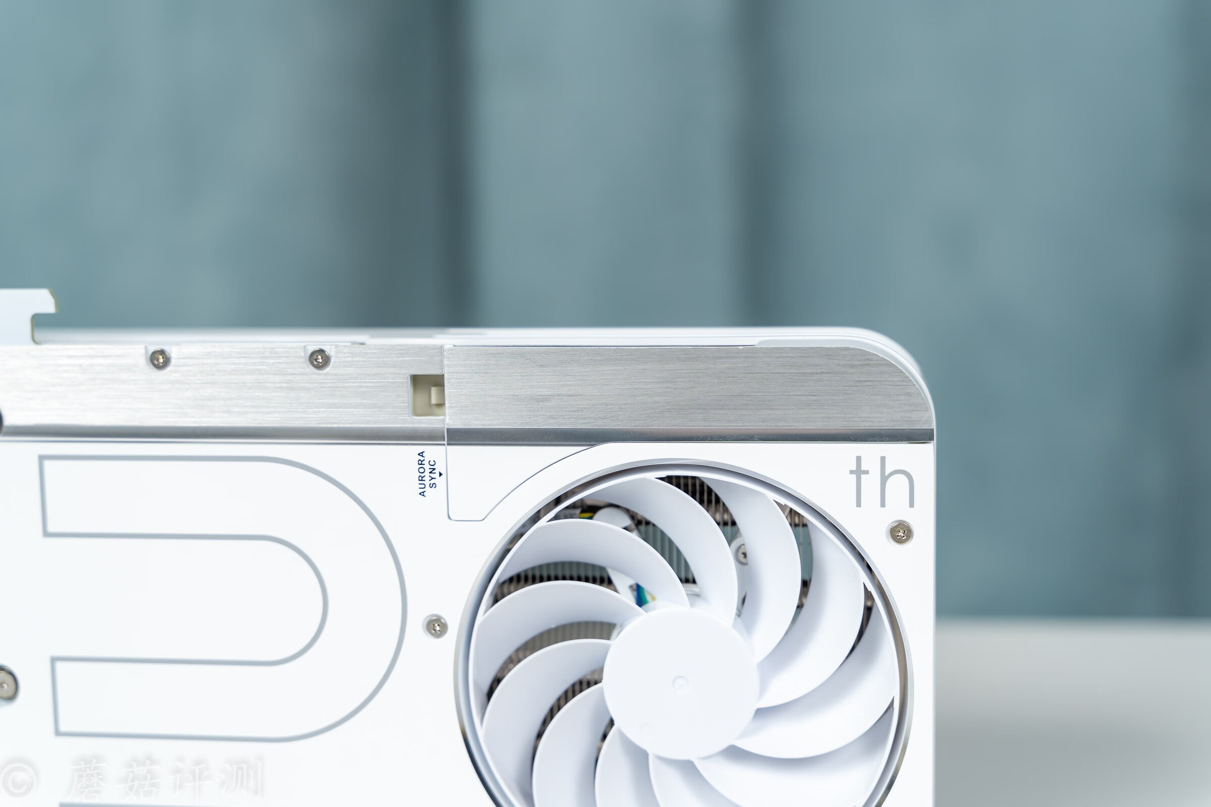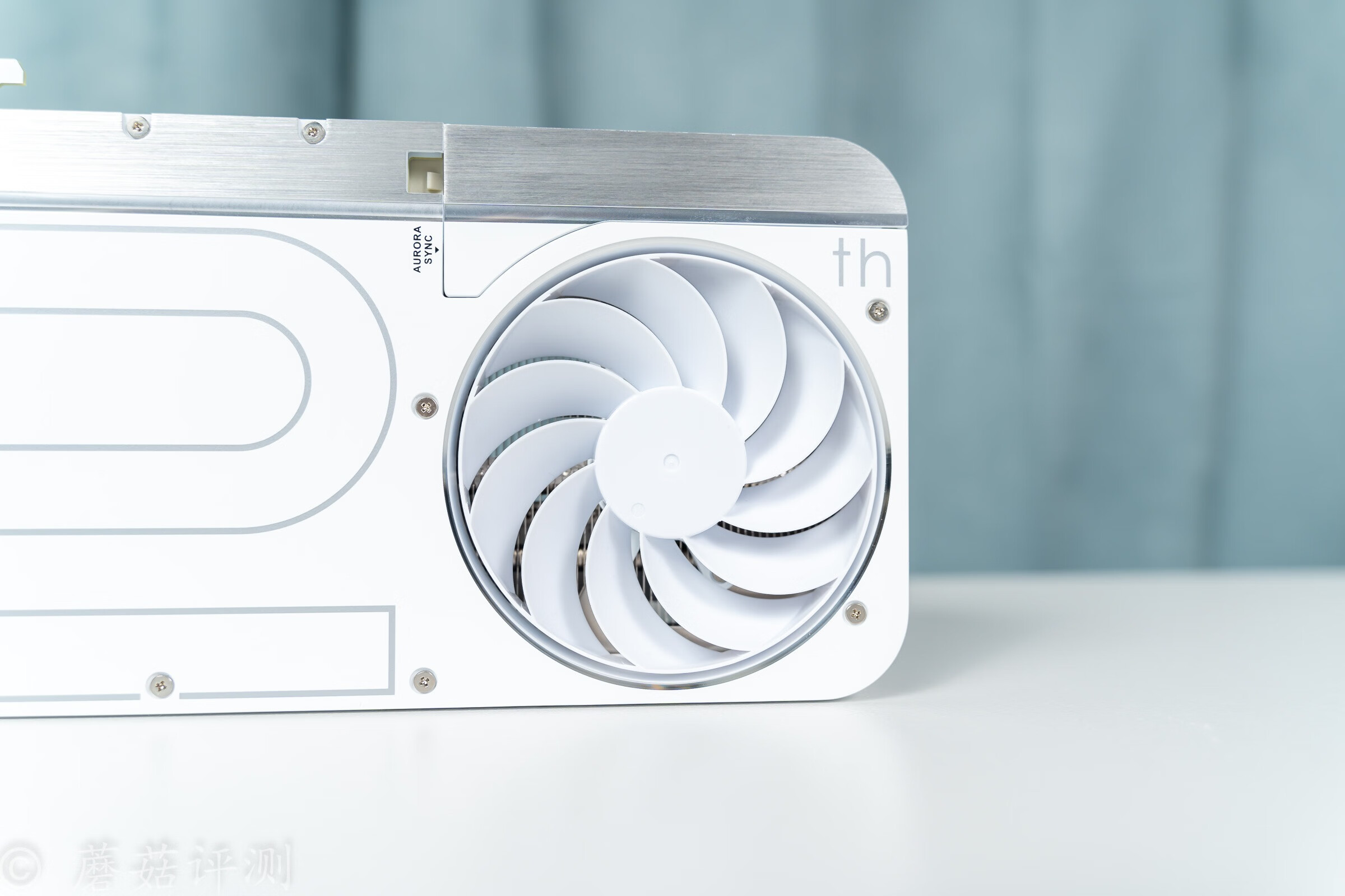 ▼显卡右侧方形镂空部分的四周,还有一圈乳白色的RGB灯带。