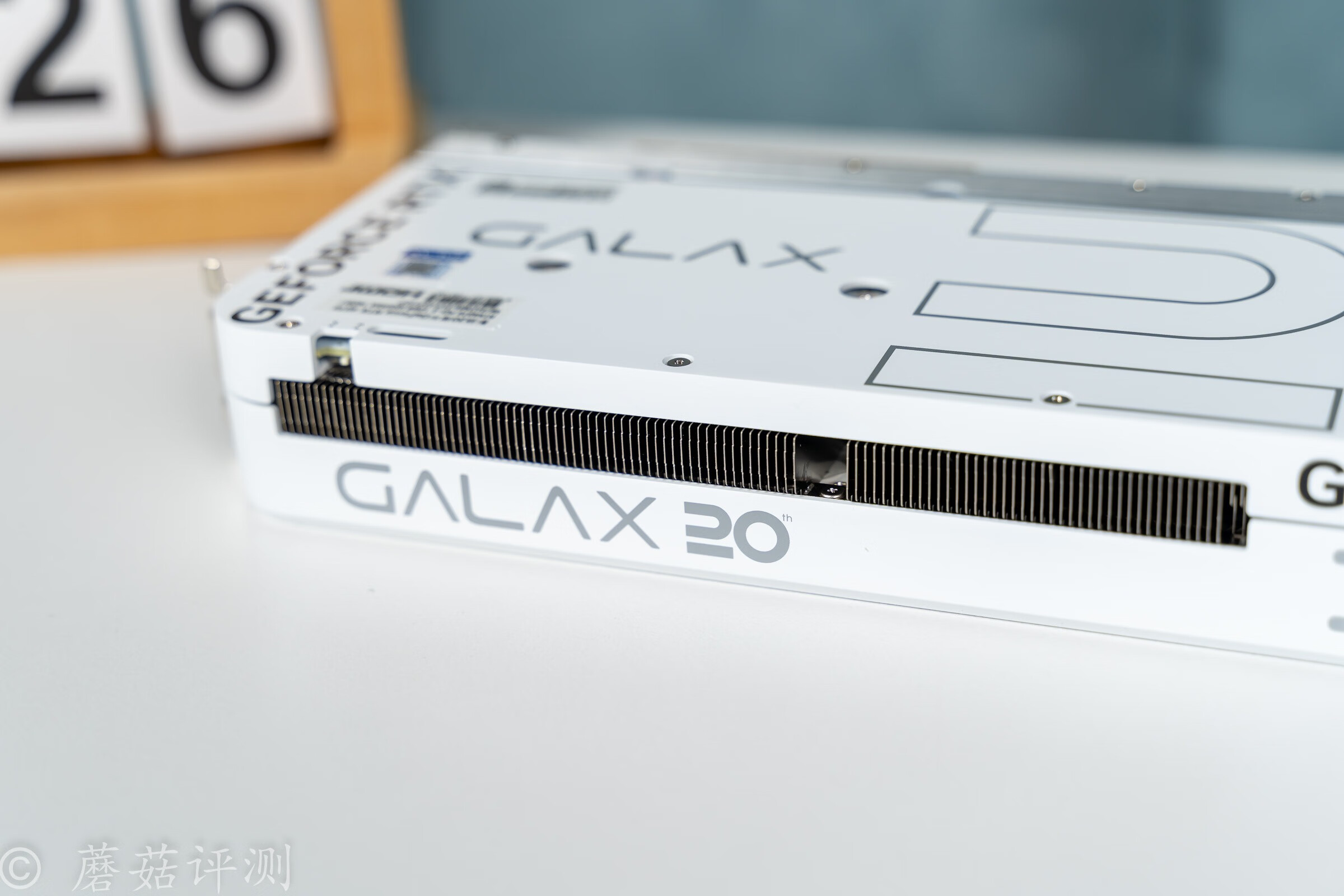 ▼白色的金属件,完整覆盖了显卡的PCB,可以有效的提高显卡整体的强度和寿命表现。另外在显卡PCIe接口的右侧,还有一个烫金的20th,也是纪念影驰20周年。