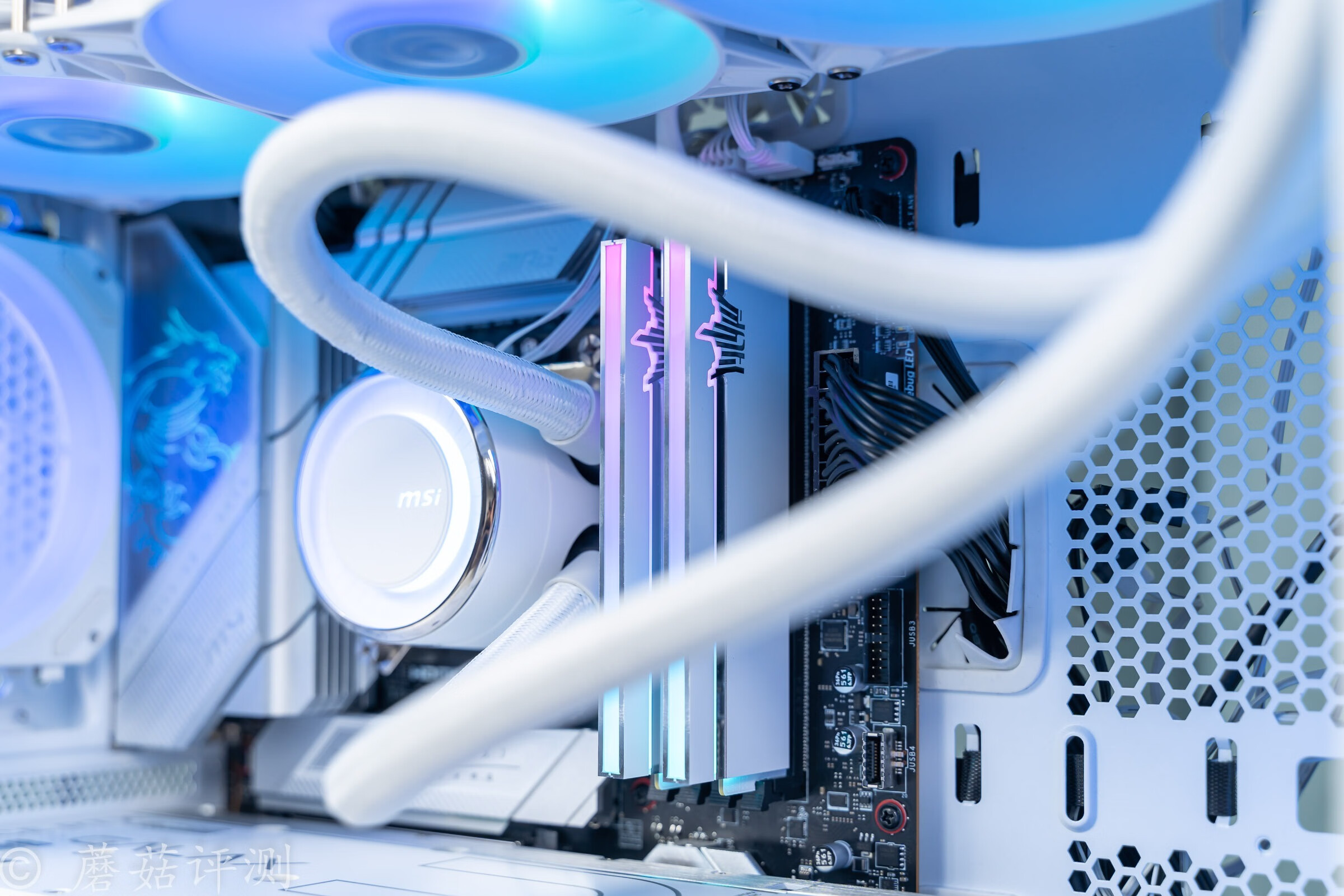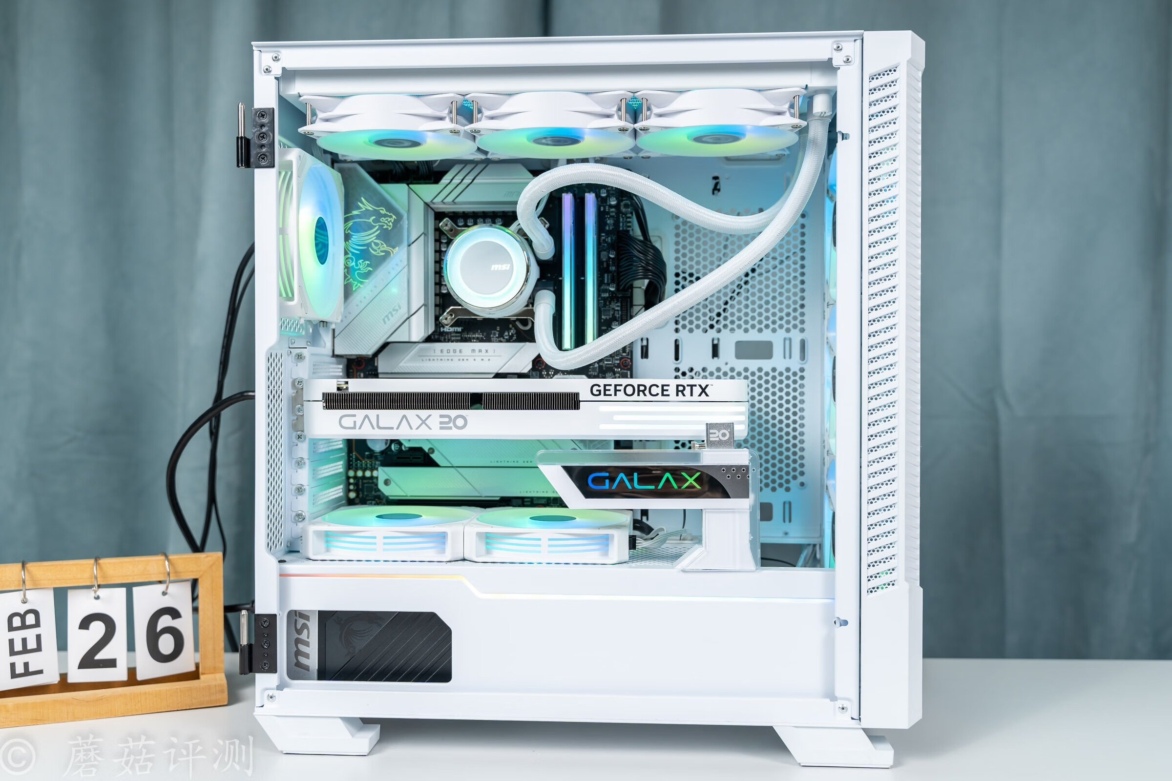 ▼机箱是微星的刀锋100R白色版,机箱的前部和侧面标配有大面积的玻璃侧透,可以更好的展示机箱内部的硬件。另外在机箱前部的玻璃内侧,标配有三把白色的、ARGB灯效的机箱风扇,搭配机箱前部玻璃侧透的整体效果不错。