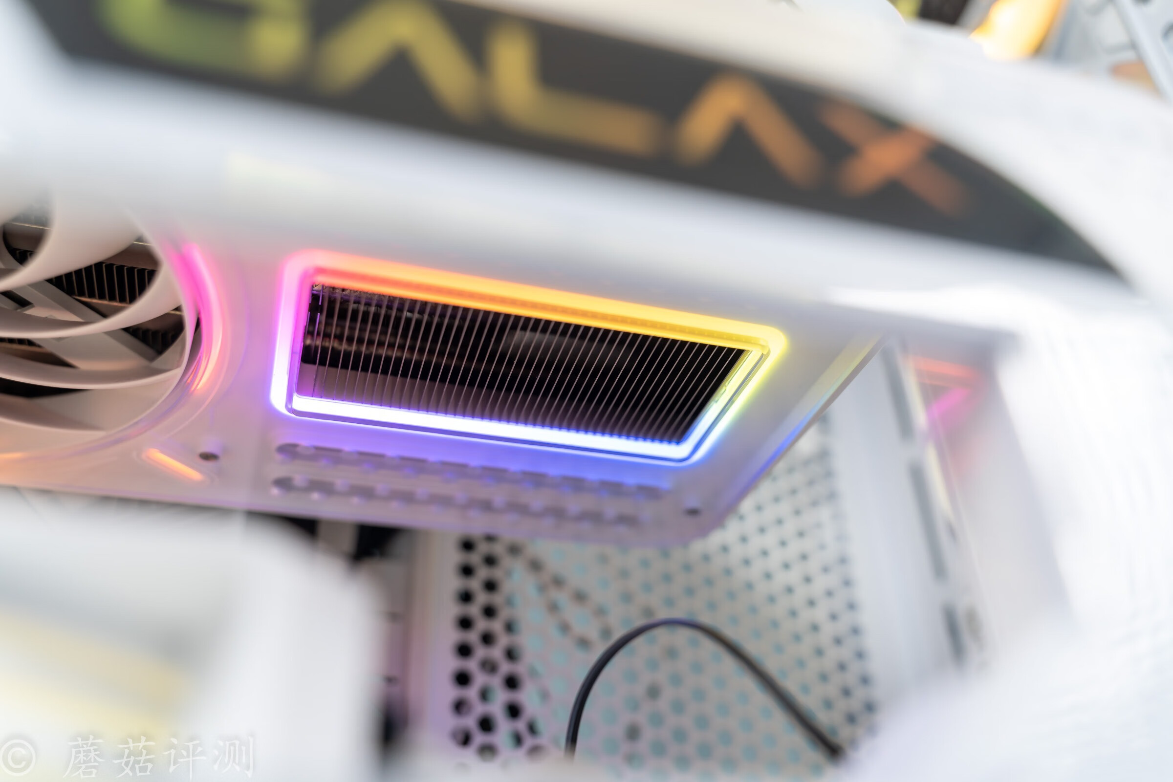 ▼显卡右侧的镂空部分,四周有一圈完整的RGB灯带,效果不错。
