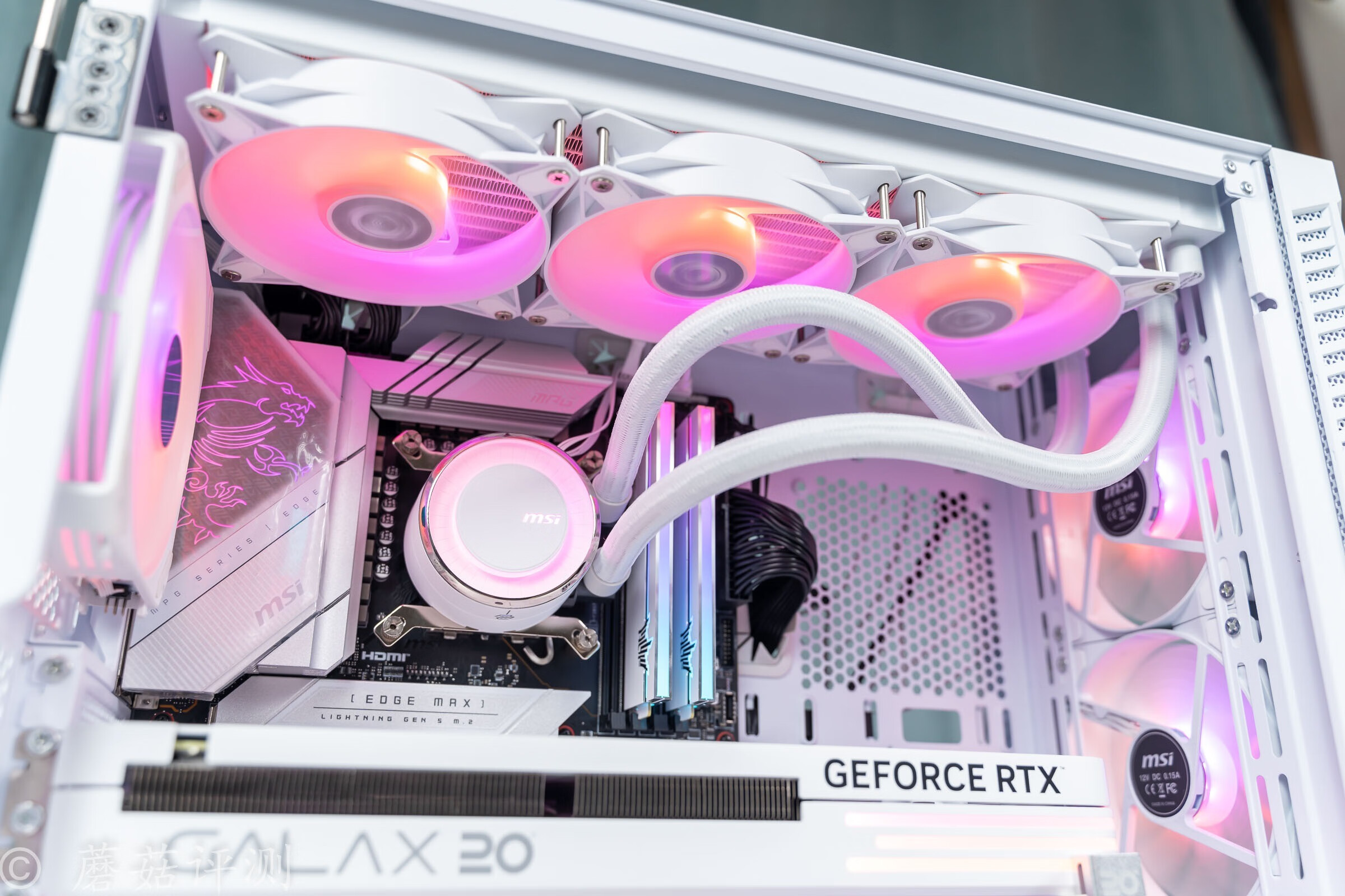 ▼散热是微星的寒冰E360白色限定版,水冷头顶部的造型非常漂亮,灯效设计也很有意思,巧妙的通过反射,将ARGB灯效展现出来。另外这个水冷头顶部的造型支持旋转,方便搭配不同的安装位置,始终让水冷头顶部的造型保持合适的角度。