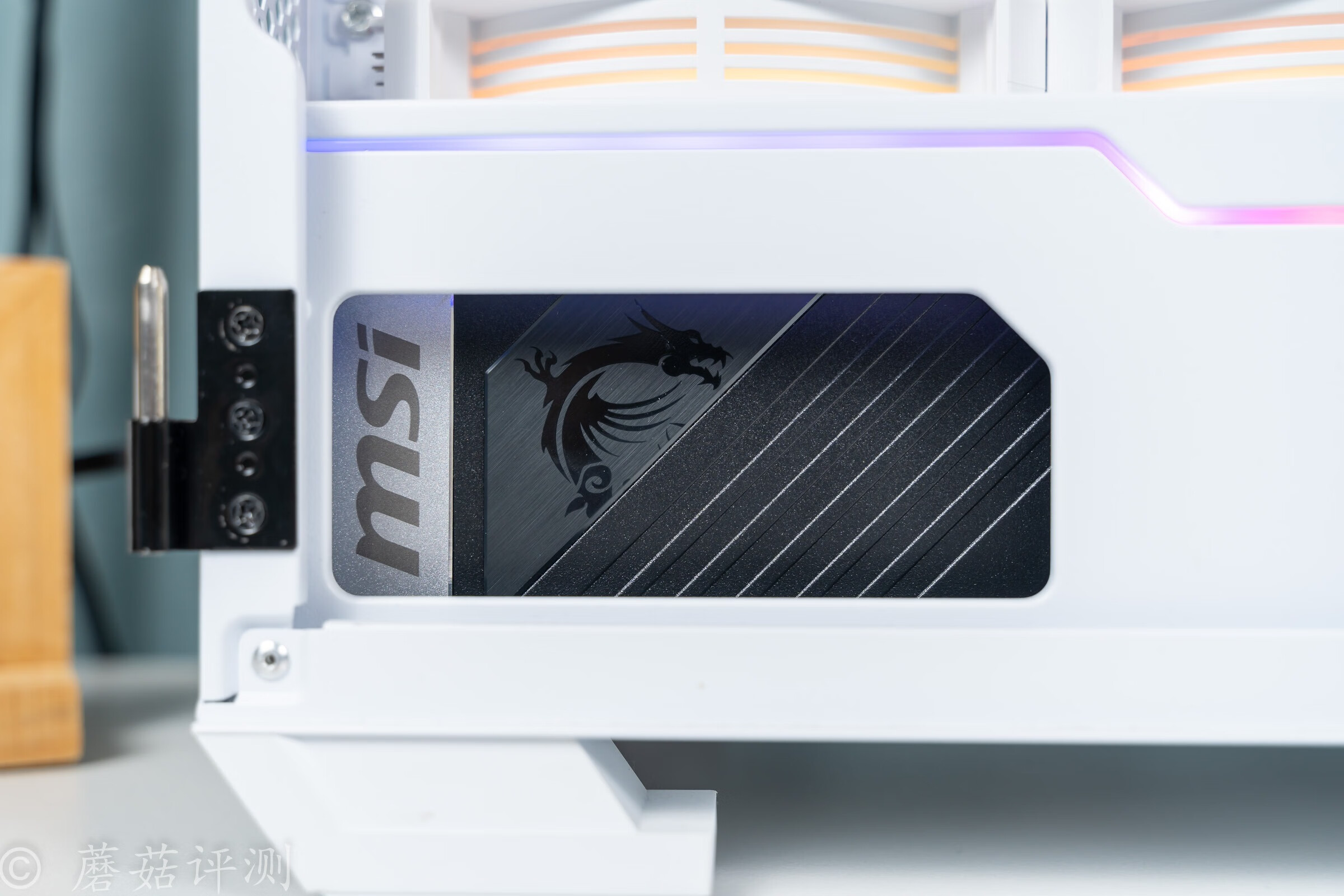 ▼机箱侧面电源仓的顶部,有一条RGB灯带,支持ARGB灯效,让机箱侧面的RGB视觉观感更加均衡。