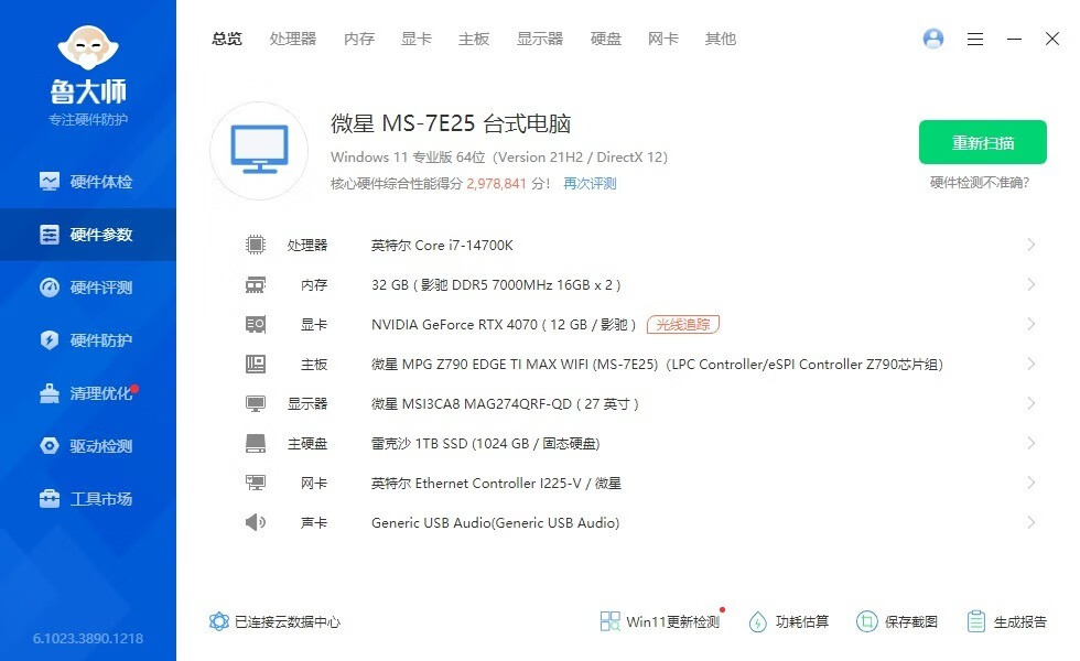 ▼整机配置一览,处理器是14700K,主板是微星的Z790刀锋MAX,显卡是影驰的RTX4070 20周年纪念版。