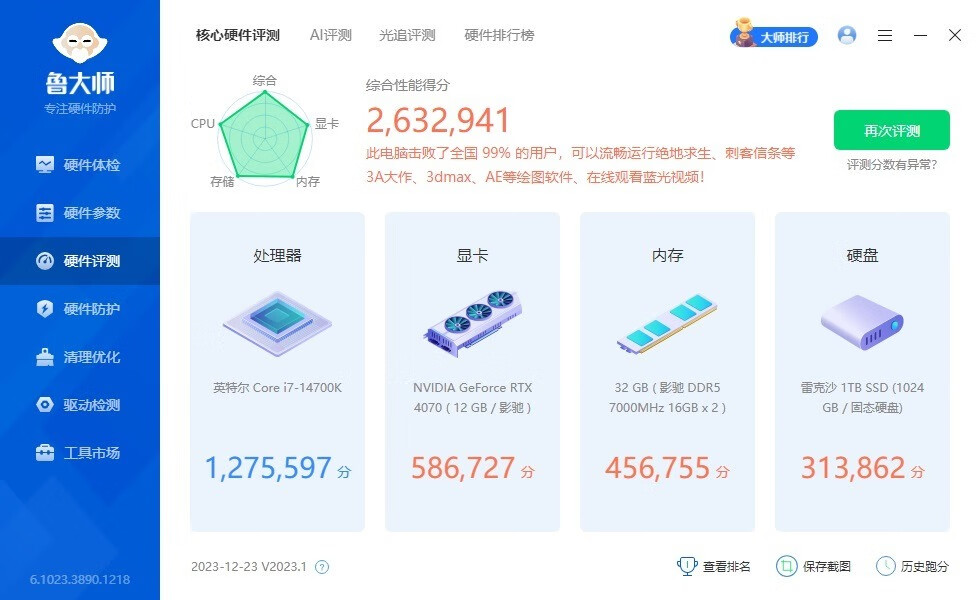 ▼简单跑个整机测试,整机得分263.2W,处理器单独得分127.5W,显卡单独得分58.6W,内存得分45.6W,分数都很给力。