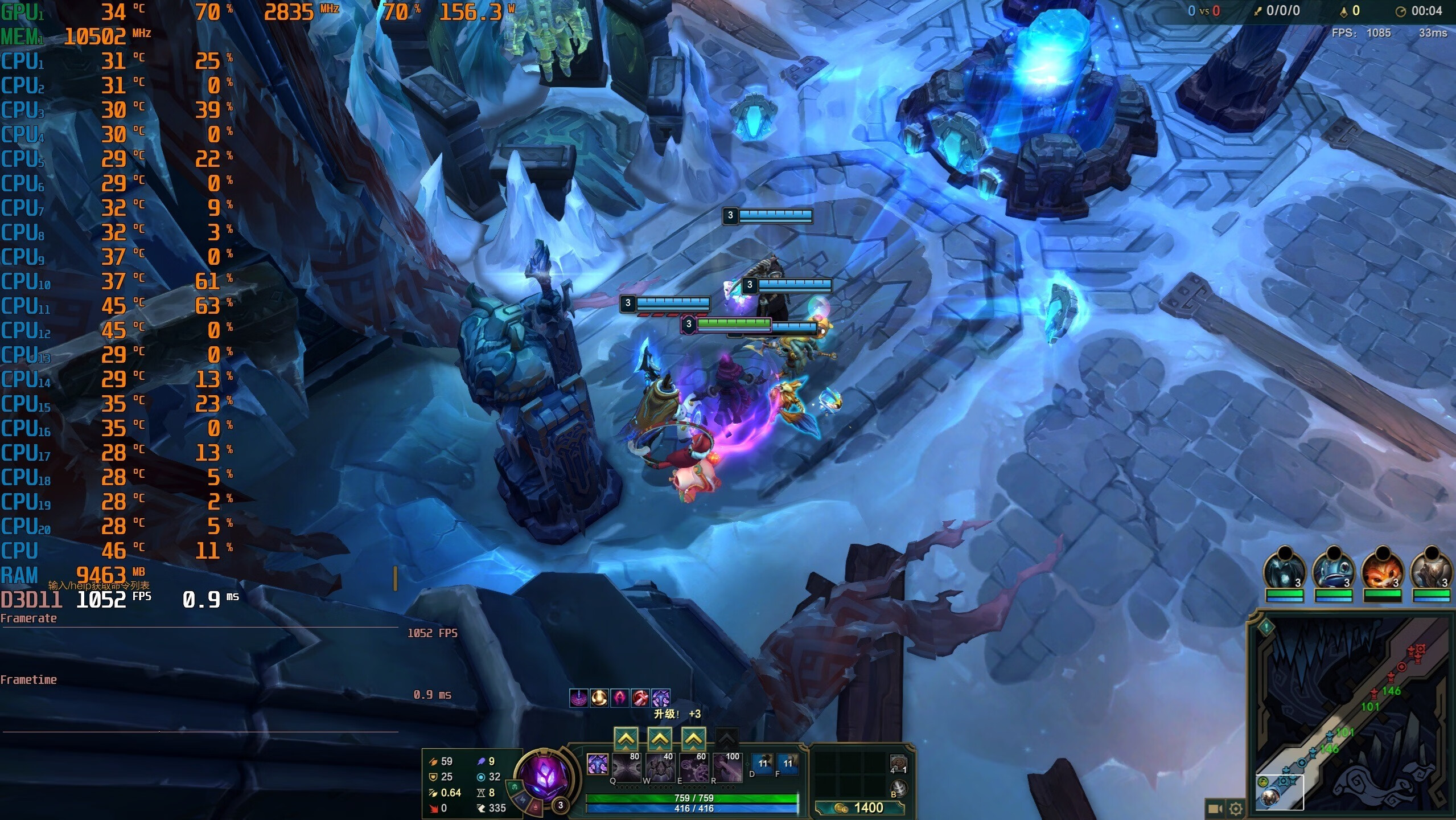 ▼游戏实测,LOL大乱斗模式,2K分辨率,全极高特效,泉水游戏帧数在1052帧左右,非常流畅。