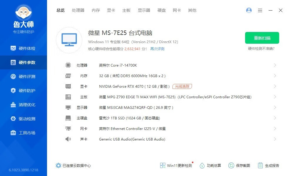 ▼整机配置一览,处理器是14700K,主板是微星的Z790刀锋MAX,显卡是影驰的RTX4070 20周年纪念版,整机配置很给力。