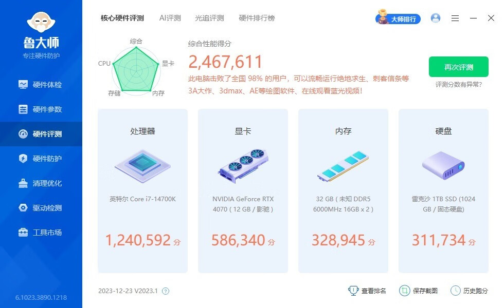 ▼简单跑个整机测试,整机得分246.7W,其中处理器单独得分124W,显卡单独得分58.6W,性能很给力。
