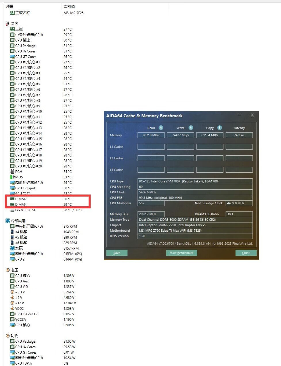 ▼简单跑个内存的读写测试,内存的温度波动很小,仅仅提升到了29℃,约等于没提升。
