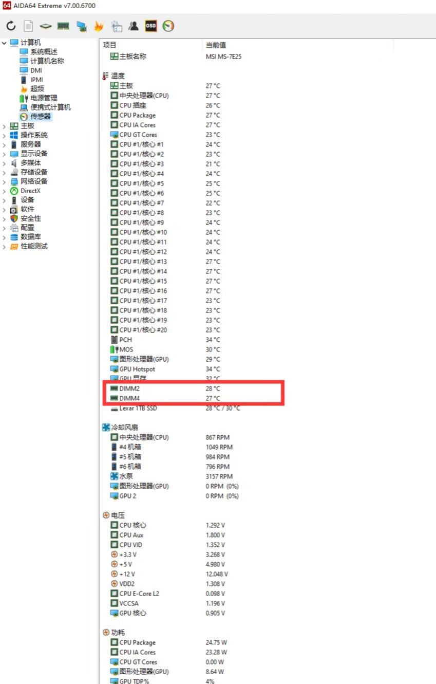 ▼中间的内存马甲的温度略高一点点,在28.9℃左右,也不高。