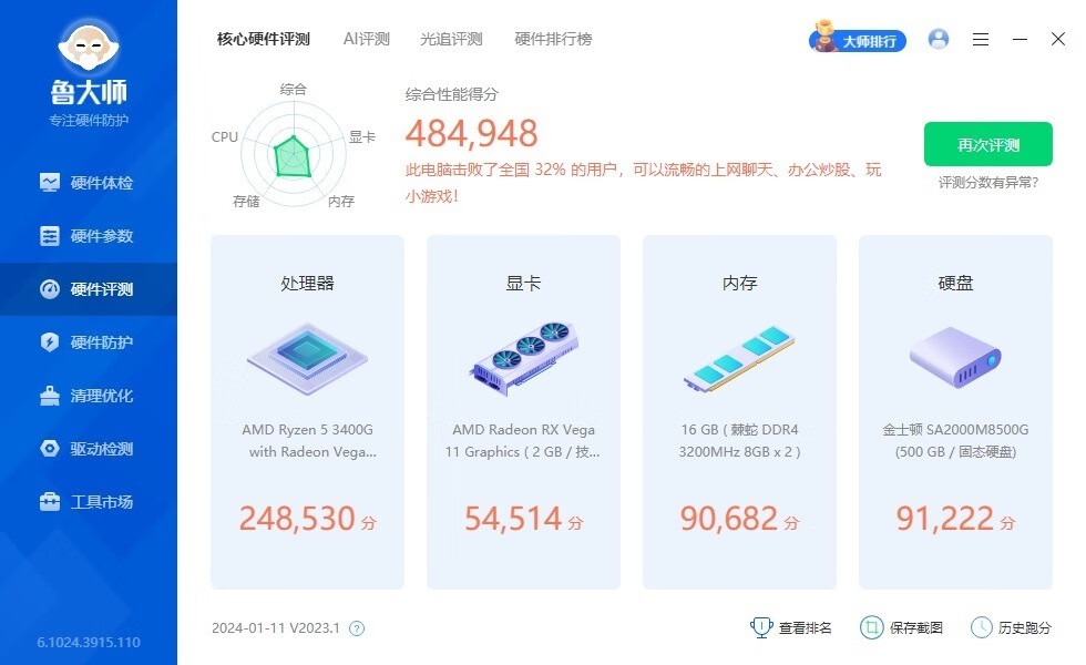 ▼简单跑个整机测试,整机得分96.9W,处理器单独得分64.6W,显卡单独得分8.3W,性能提升非常明显。